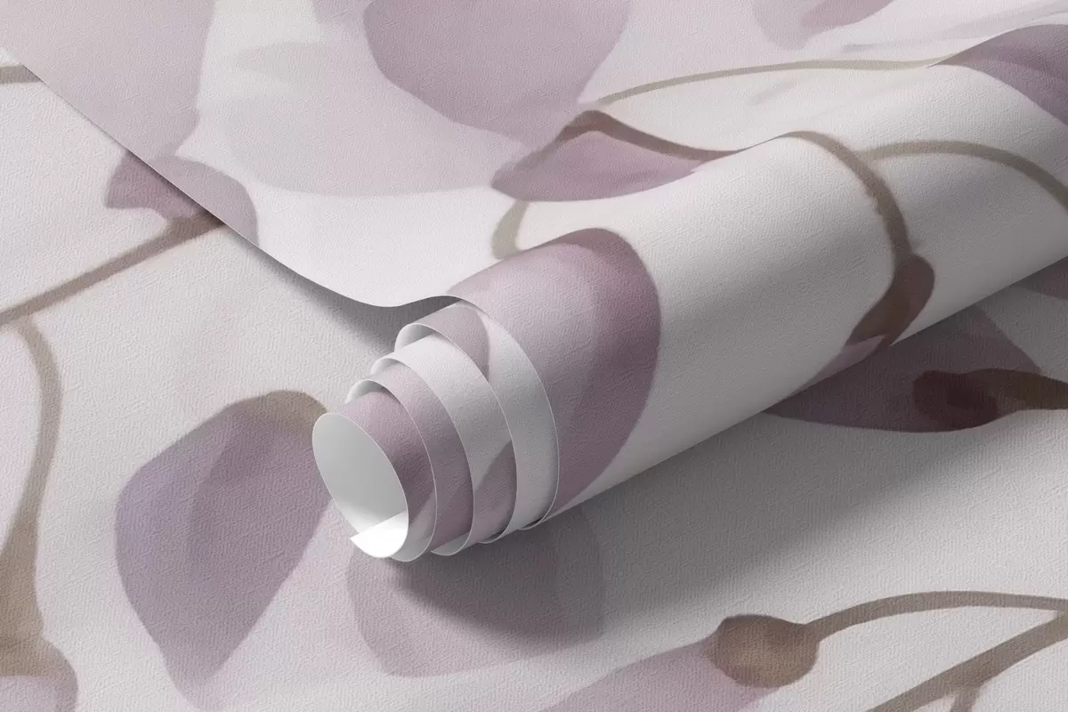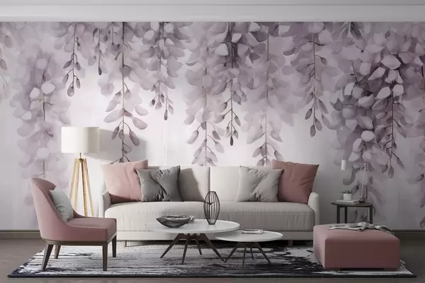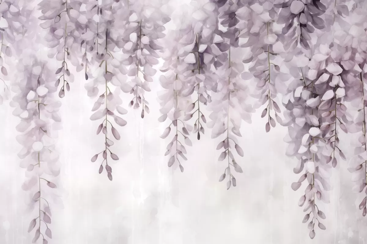 Fotomurales Escena en acuarela con suaves glicinias lilas cayendo en cascada desde lo alto, evocando la calma y la claridad de una bruma matinal Nr. w04034v3