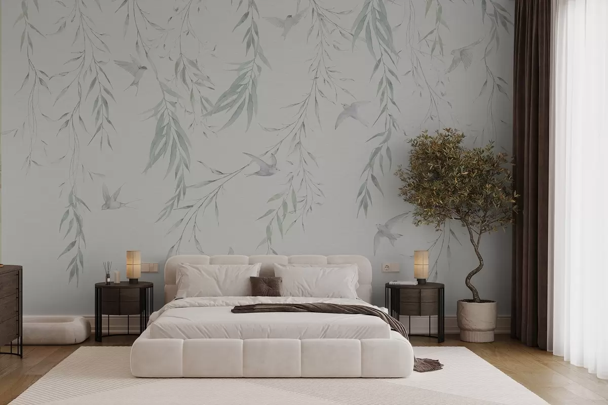 Fotomurales Ramitas con hojas verdes colgando y pájaros Nr. w04052