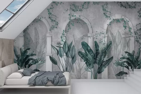 Fotomurales Muro de hormigón con arcos y plantas tropicales, florales, colores azules Nr. w04065v2