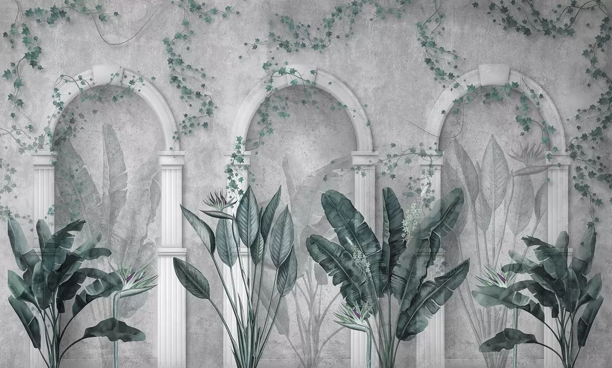 Fotomurales Muro de hormigón con arcos y plantas tropicales, florales, colores azules Nr. w04065v2
