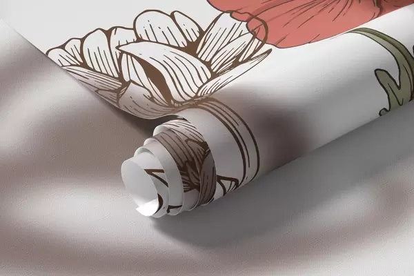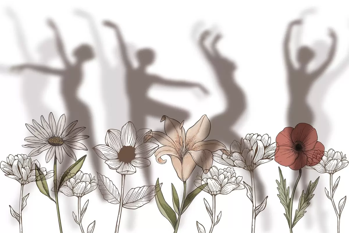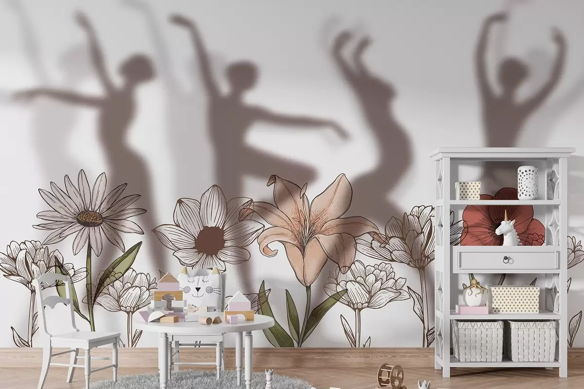 Fotomurales Siluetas de bailarinas, flores rústicas, arte lineal, colores rojo y beige Nr. w04069