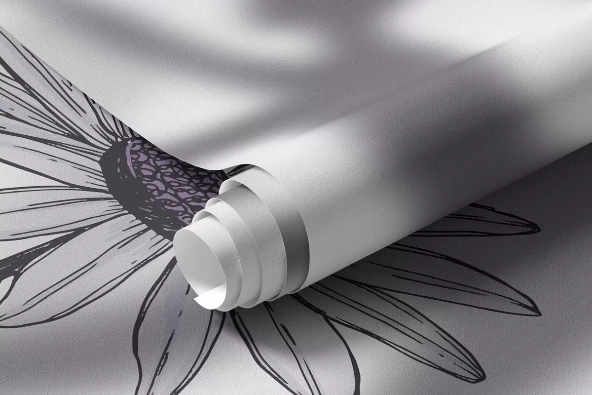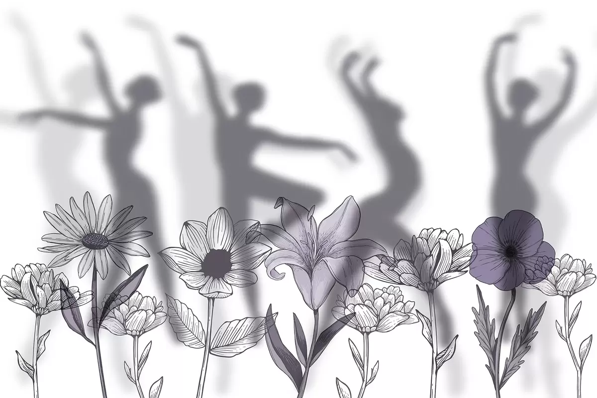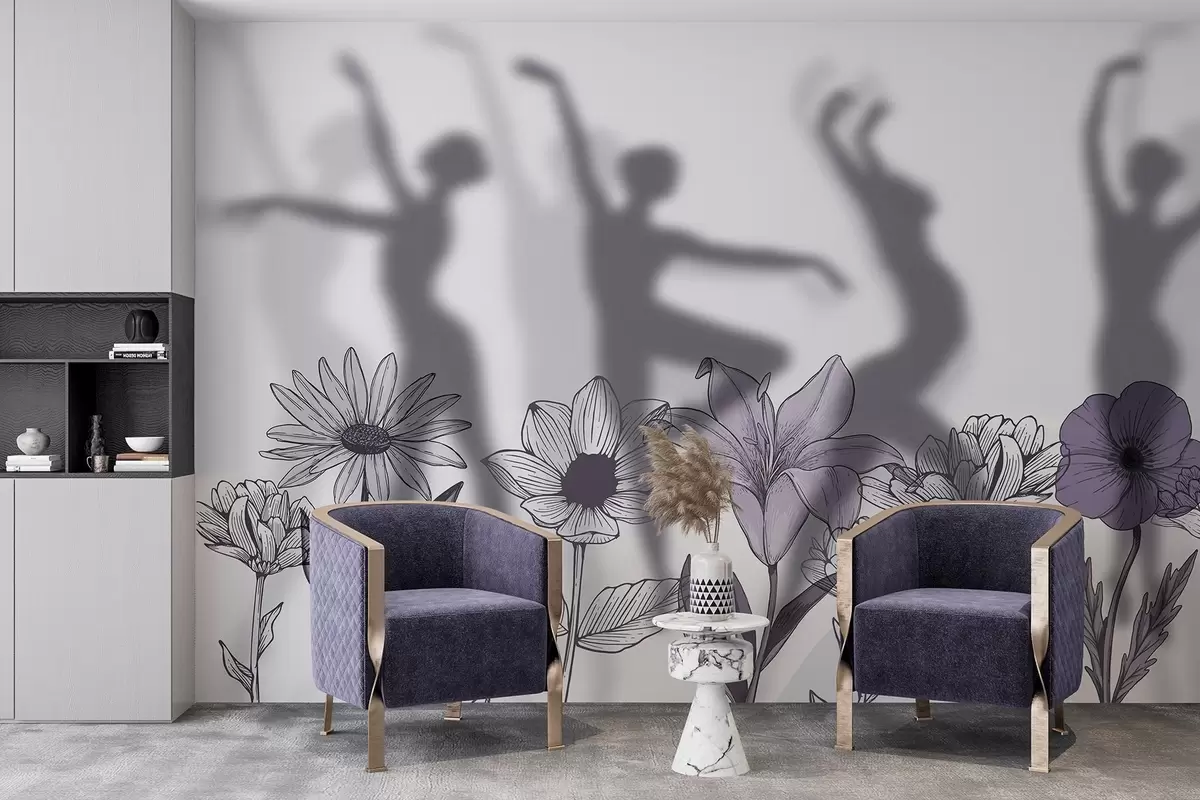 Fotomurales Siluetas de bailarinas, flores rústicas, arte lineal, colores gris y morado Nr. w04069v2