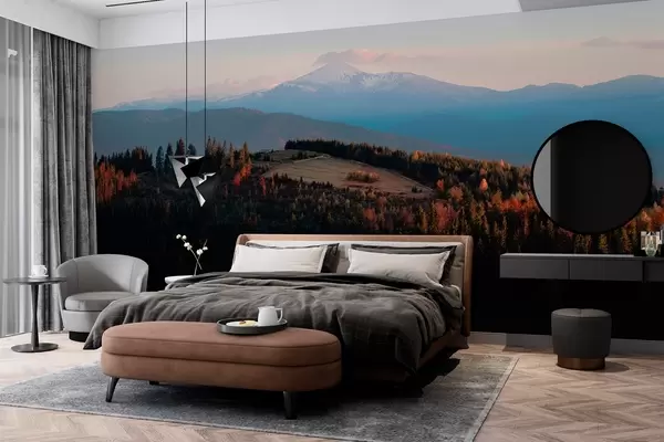 Fotomurales Montañas de los Cárpatos, textura al óleo, bosque otoñal, cielo al atardecer Nr. w04098