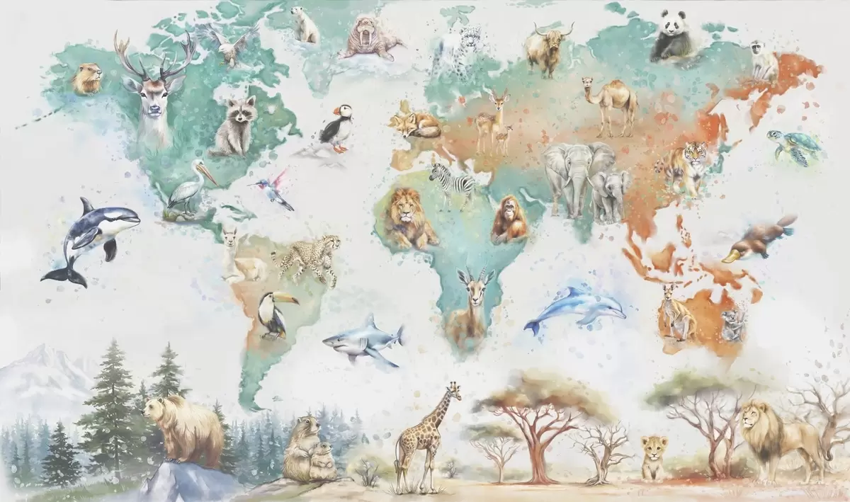 Fotomurales Mapamundi con animales, estilo de ilustración educativa infantil Nr. w04148