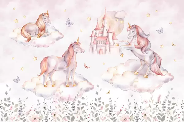 Fotomurales Unicornios en las nubes con estrellas, mariposas y flores Nr. w04165