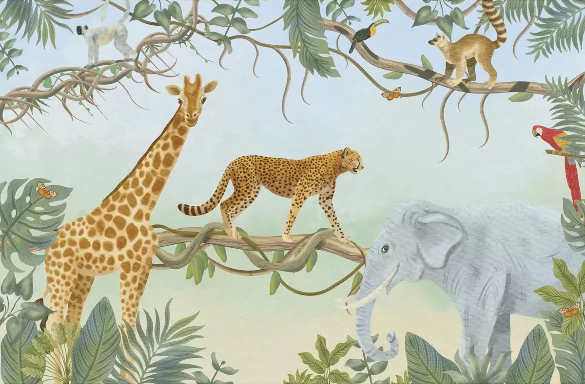 Fotomurales Ilustración de jungla con jirafa, guepardo y elefante Nr. w04194