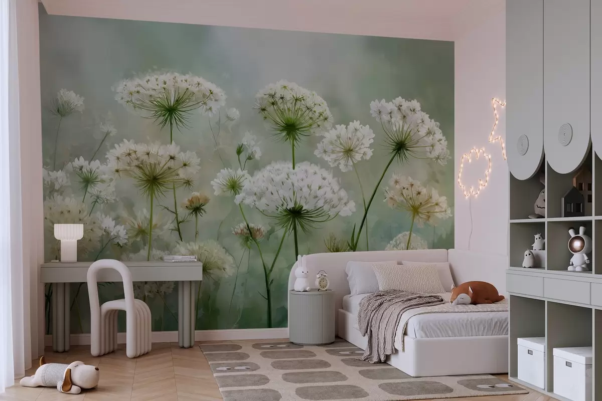 Fotomurales delicadas flores silvestres blancas Reina Ana, de estilo pintoresco, tonos verdes Nr. w04313