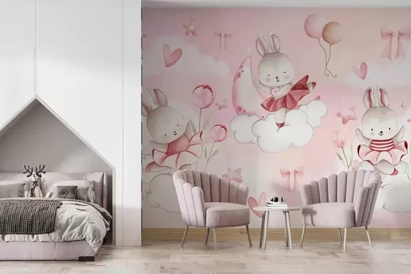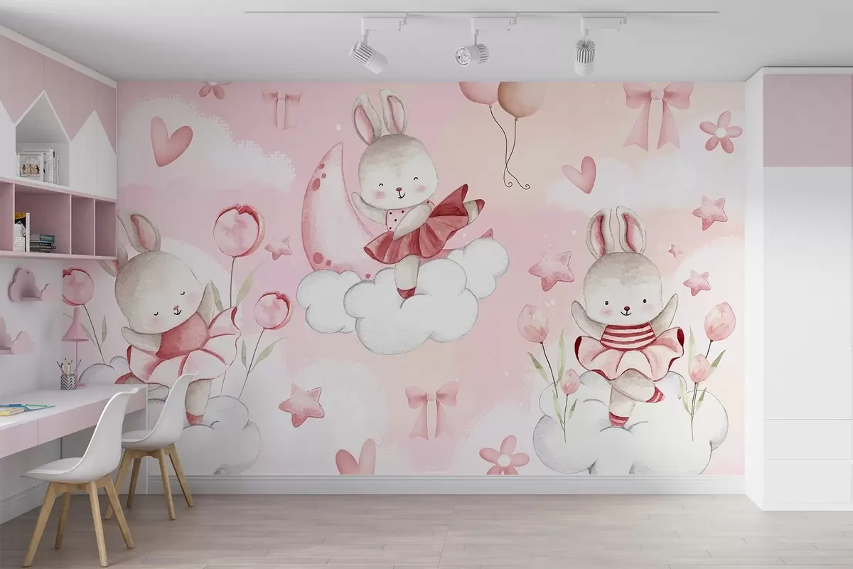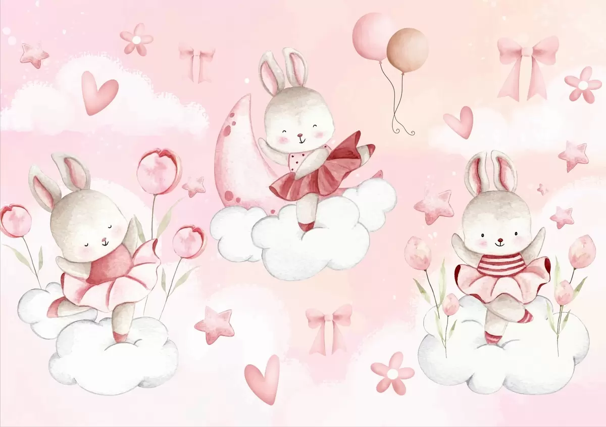 Fotomurales Conejos con vestidos de ballet rosas sobre nubes Nr. w04333
