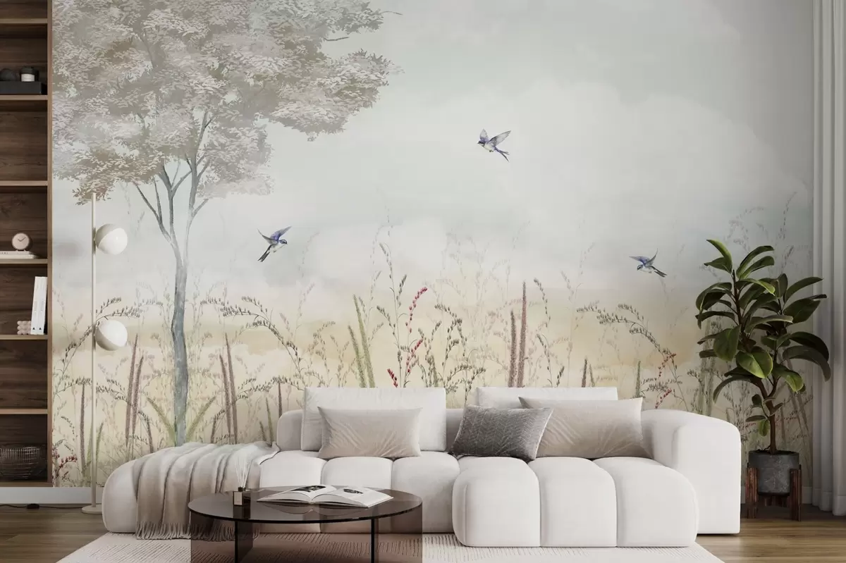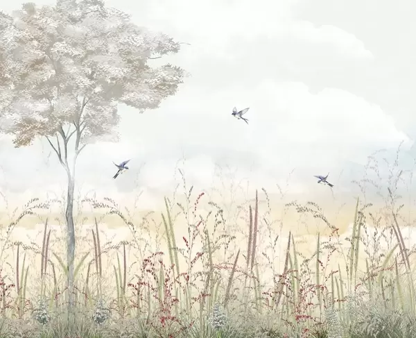 Fotomurales Paisaje con árboles, pájaros y hierbas de prado Nr. w04350