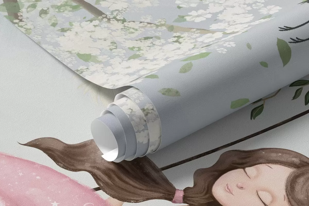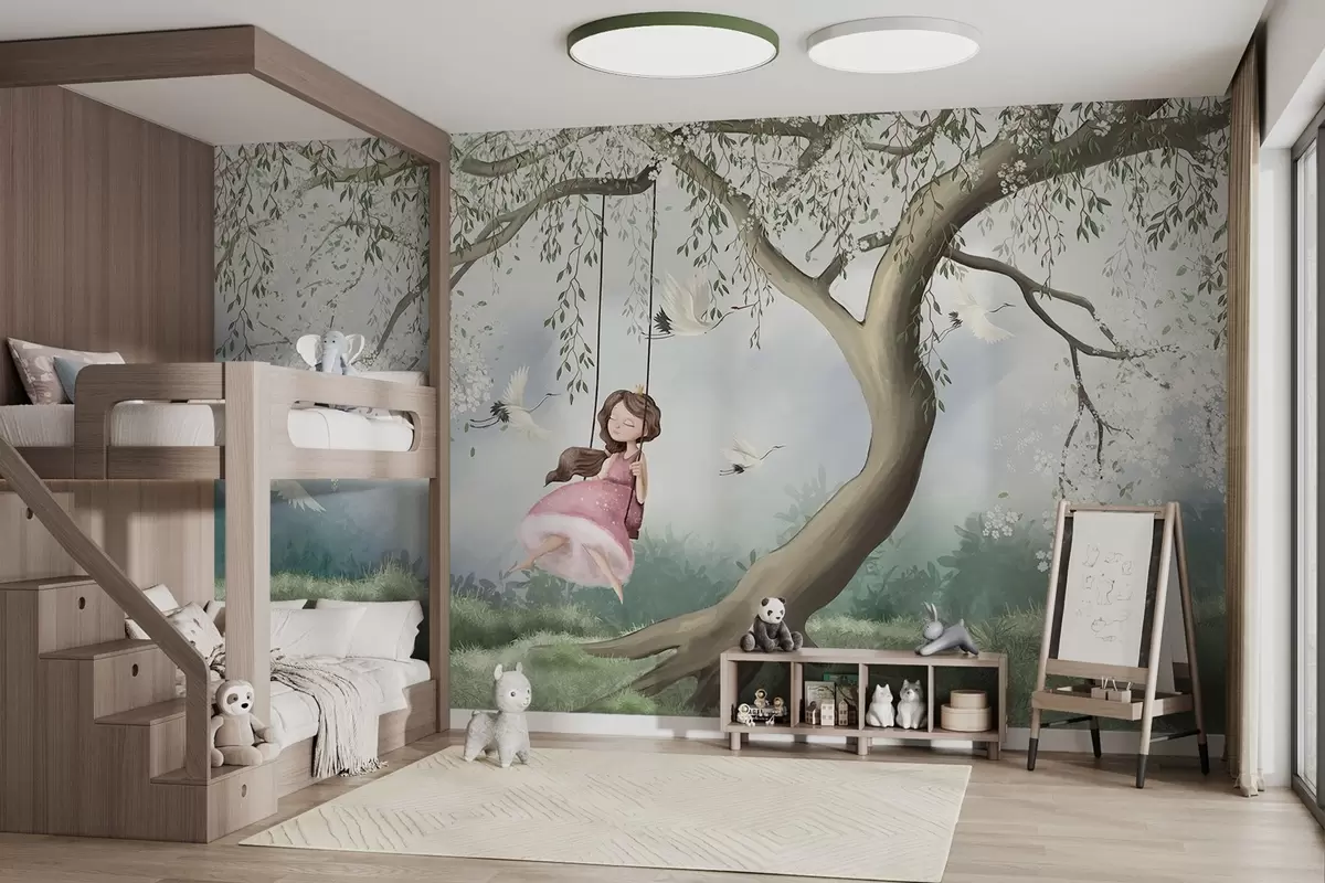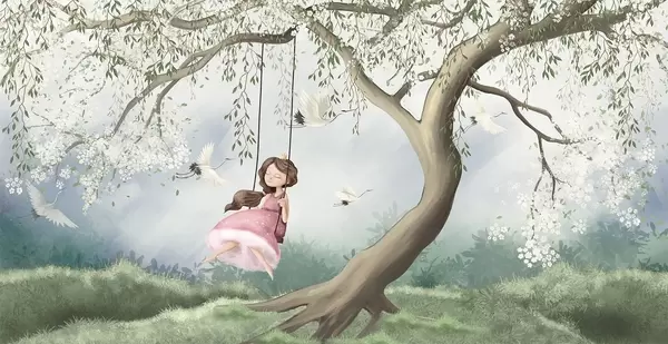 Fotomurales Niña en columpio bajo árbol en flor con pájaros volando alrededor Nr. w04370