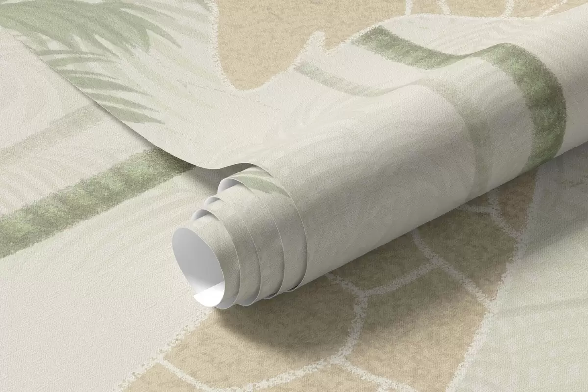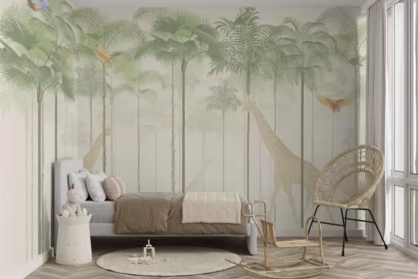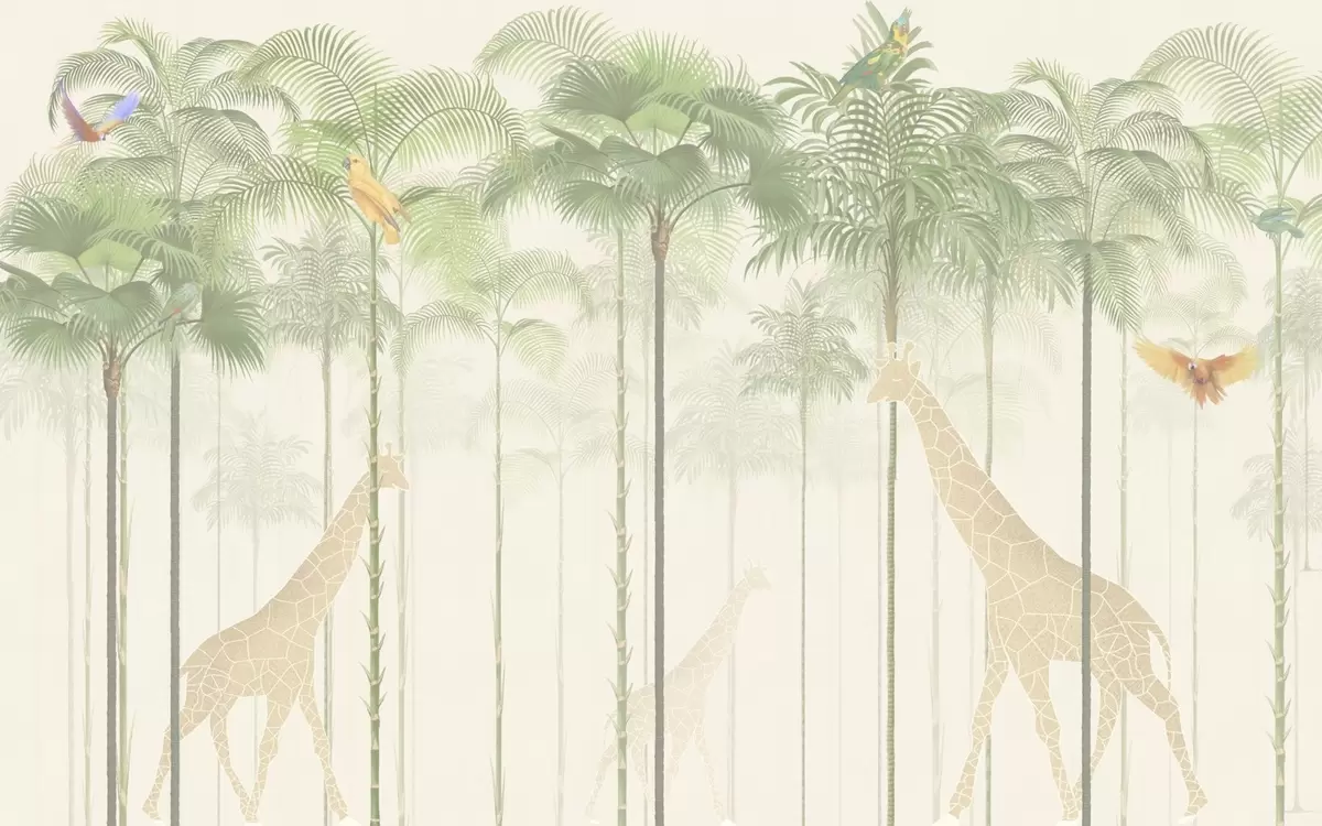 Fotomurales Jirafas y aves tropicales entre altas palmeras Nr. w04400
