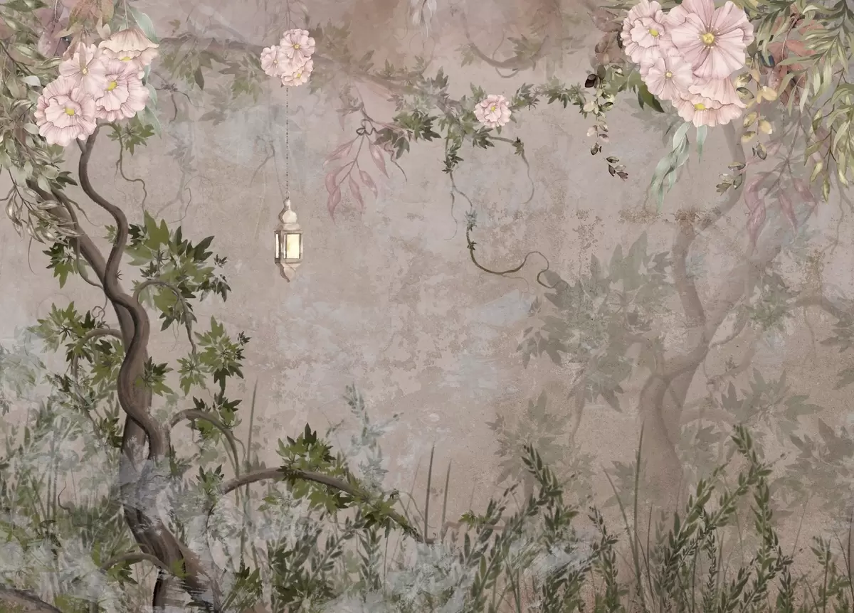 Fotomurales Jardín de hadas con flores, árboles y farolillo Nr. w04416