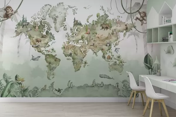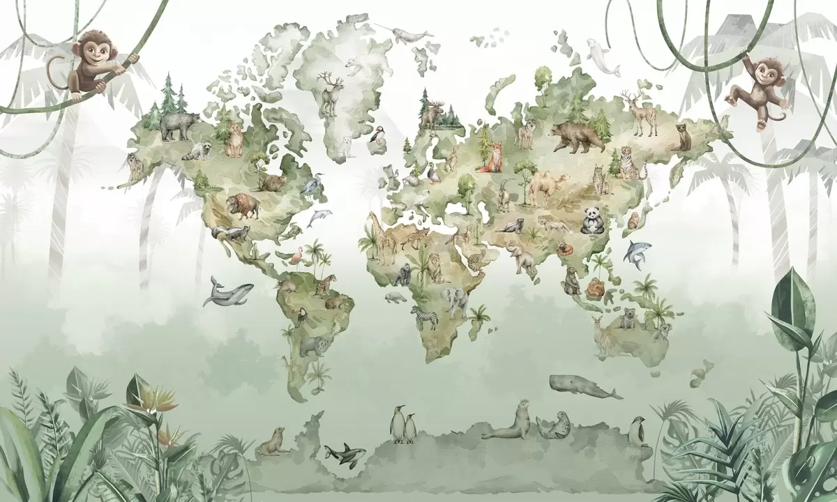Fotomurales Mapamundi en acuarela con animales Nr. w04418