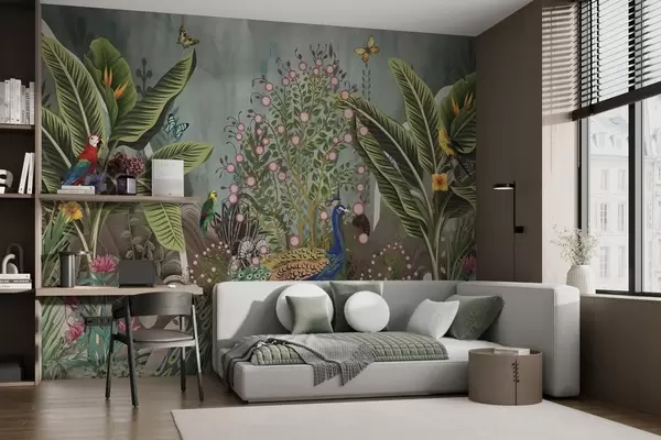 Fotomurales Brillantes pájaros tropicales y pavos reales entre plantas exóticas Nr. w04457
