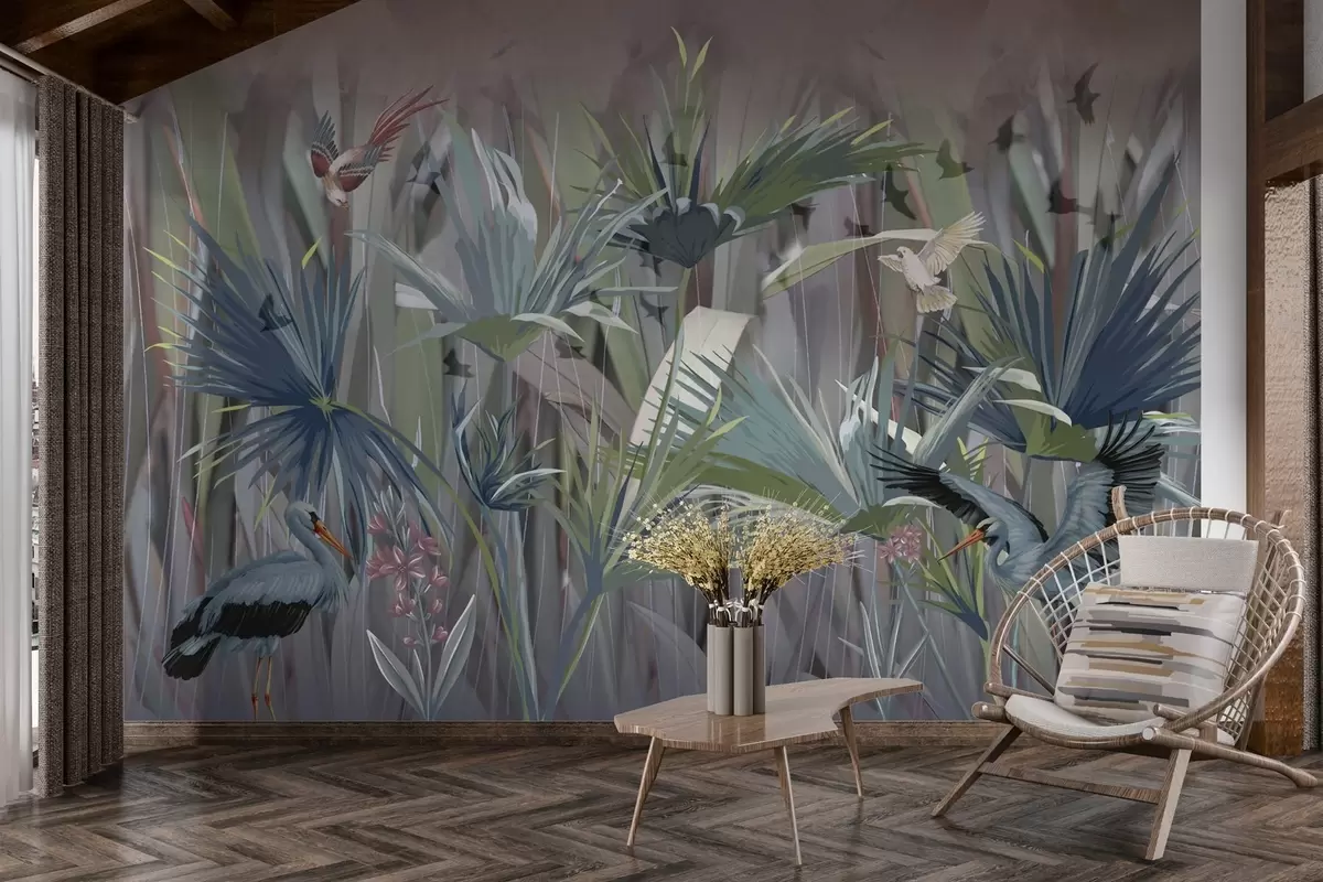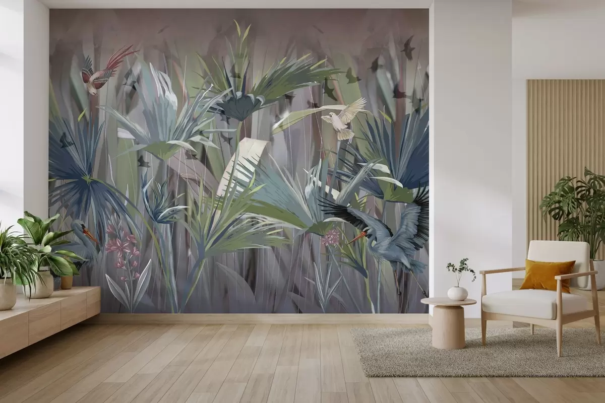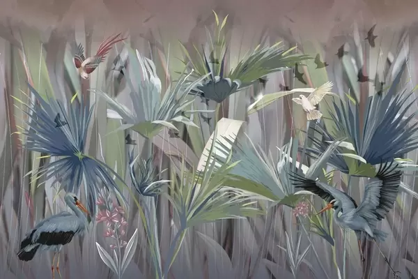 Fotomurales Pájaros exóticos entre palmeras y flores Nr. w04458