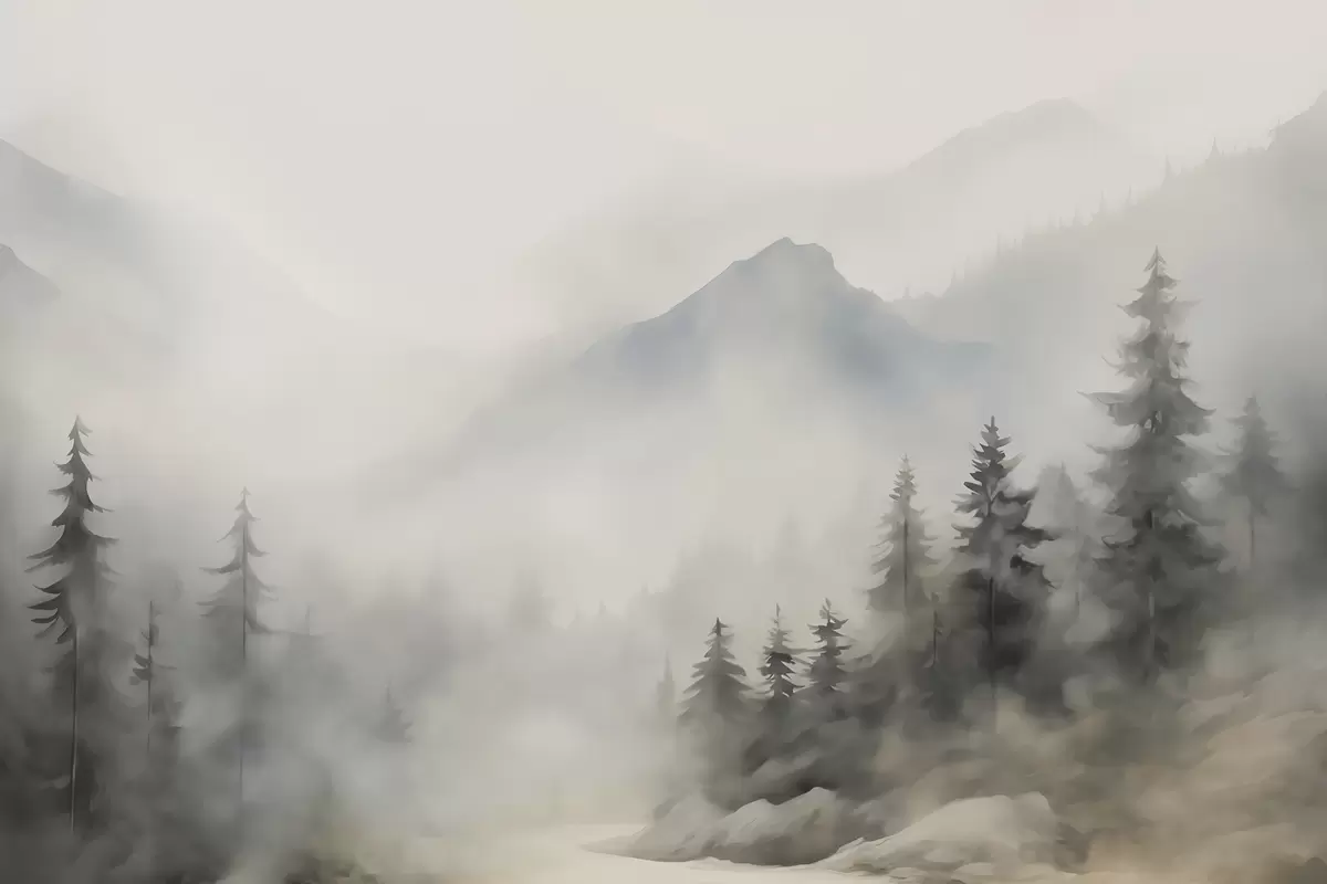 Fotomurales Bosque en la niebla con las montañas como telón de fondo Nr. w04493