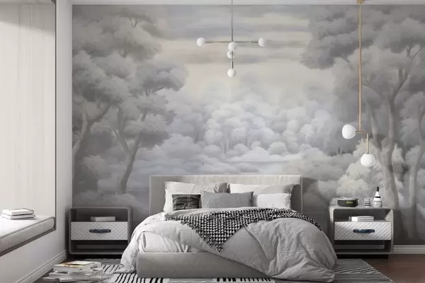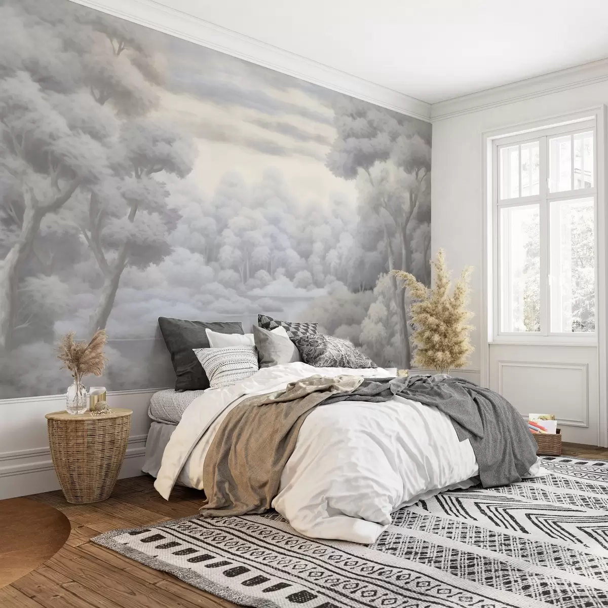 murales de pared Bosque brumoso y lago en suaves tonos grises w04617