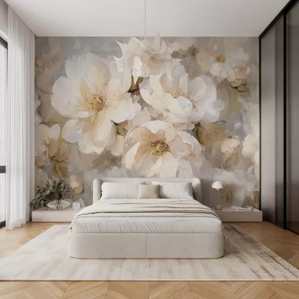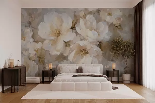 murales de pared flores grandes en tonos blancos y beige al estilo de la pintura al óleo w04633