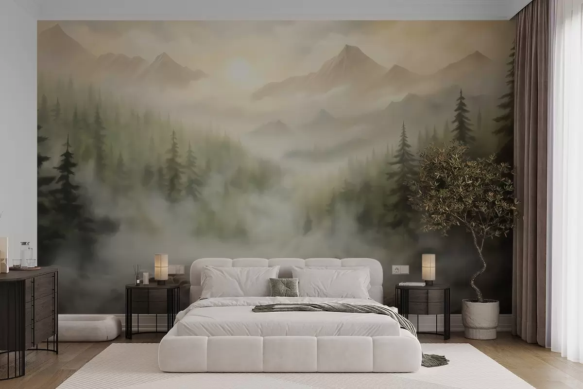 Fotomurales Bosque en la niebla con las montañas como telón de fondo Nr. w04730