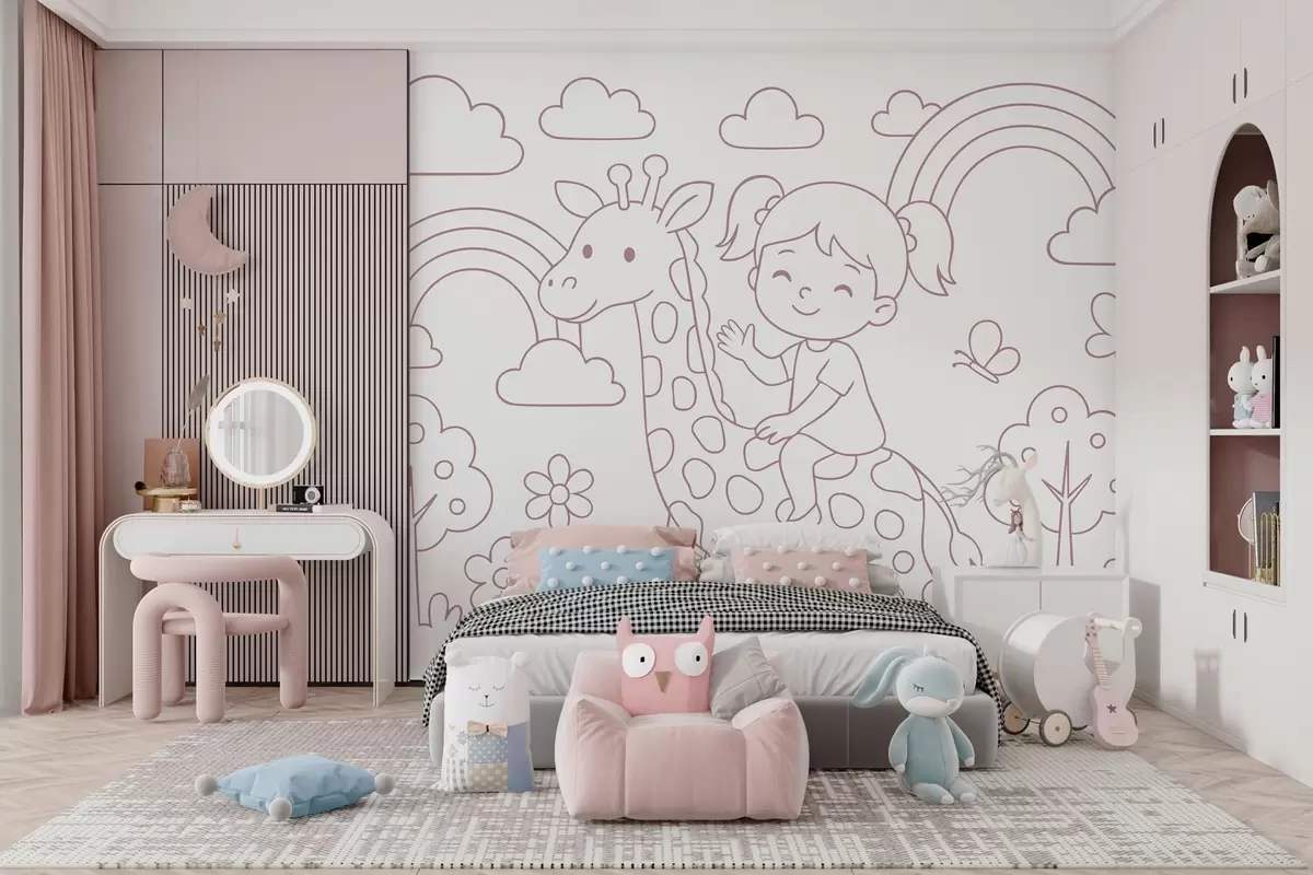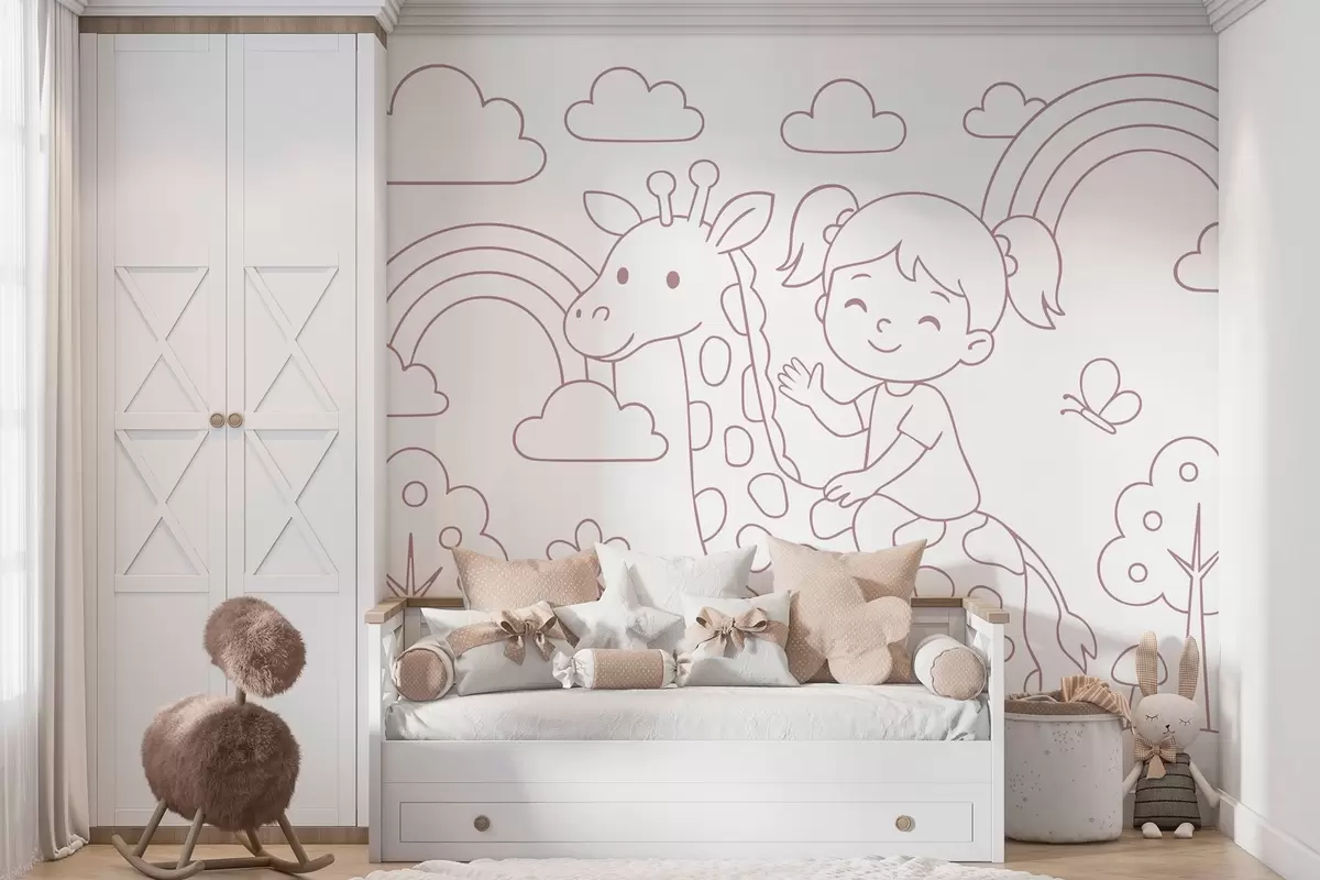 Fotomurales pintura en polvo de una niña sobre una jirafa al estilo de un libro para colorear infantil Nr. w04753v1