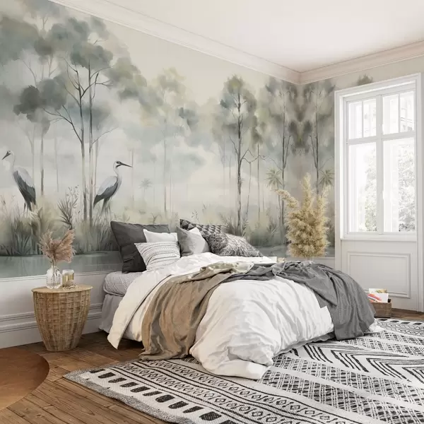 Fotomurales Bosque brumoso junto al agua con garzas, paleta de colores suaves y fríos Nr. w04788