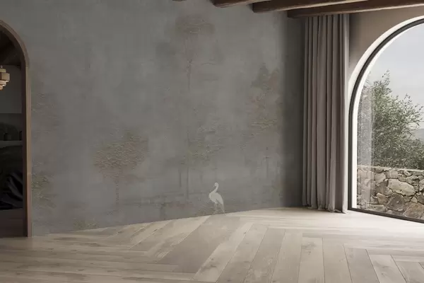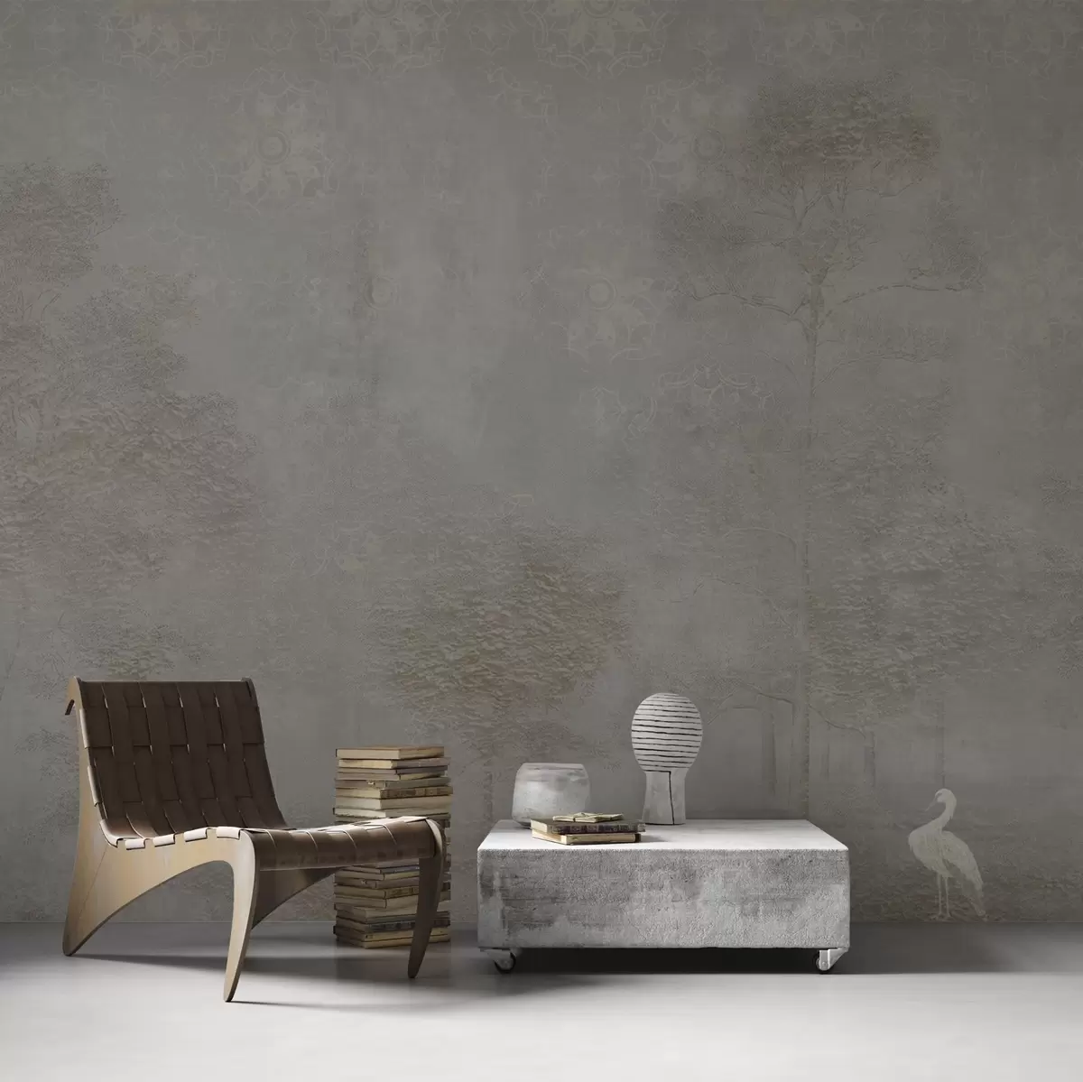 Fotomurales Bosque brumoso con una garza y un patrón ornamental encima Nr. w04953v1