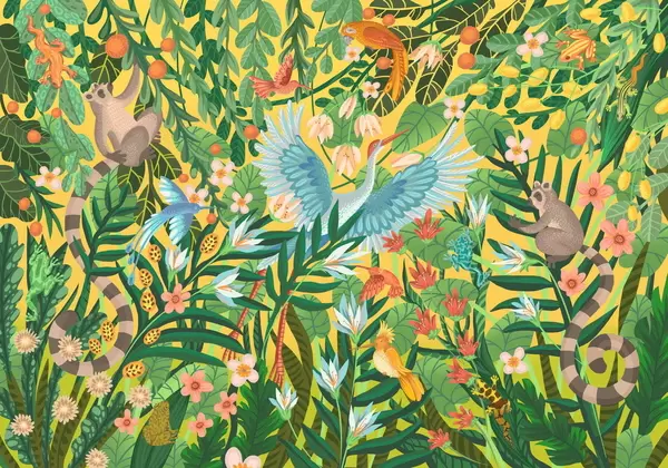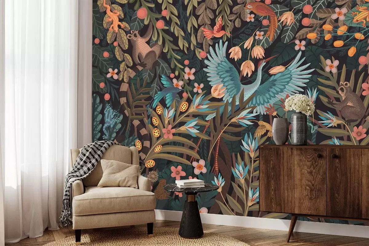 Fotomurales Escena fantástica con pájaros y animales entre plantas Nr. w05024