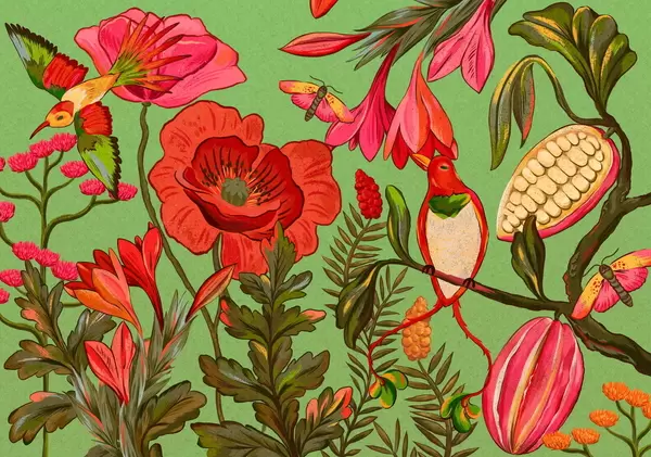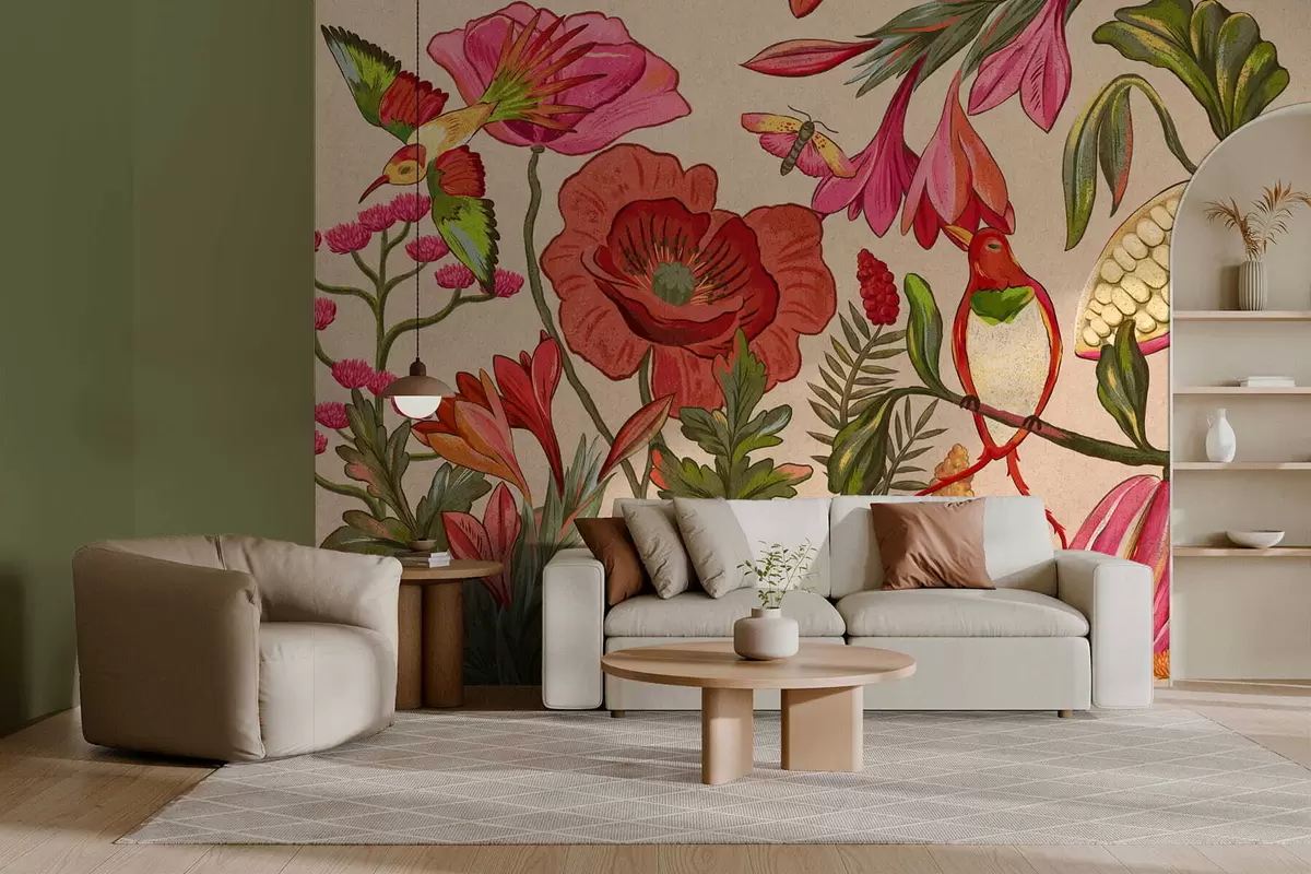 Fotomurales Flores y pájaros decorativos sobre fondo beige Nr. w05036