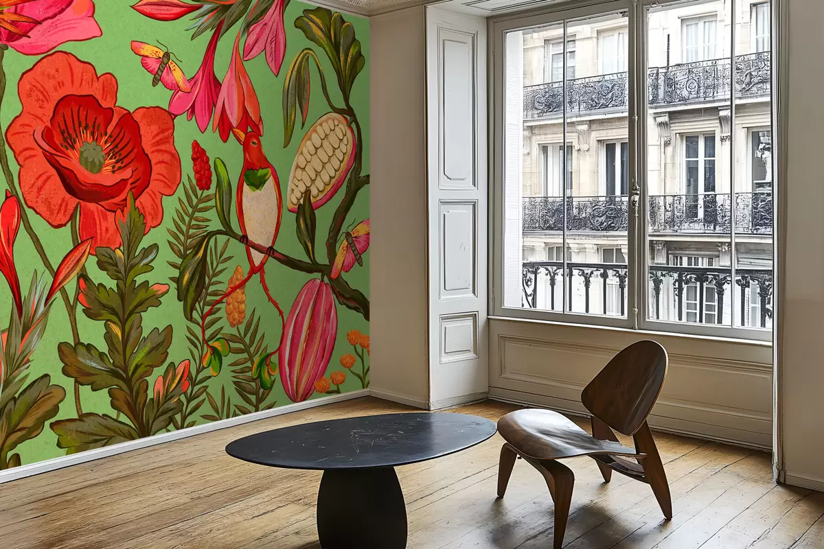 Fotomurales Flores y pájaros decorativos sobre fondo verde Nr. w05036v1