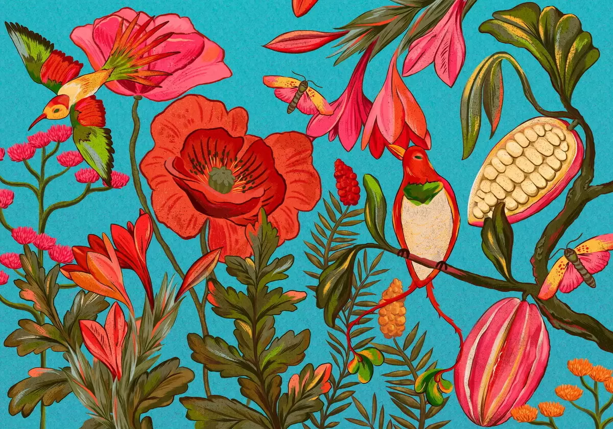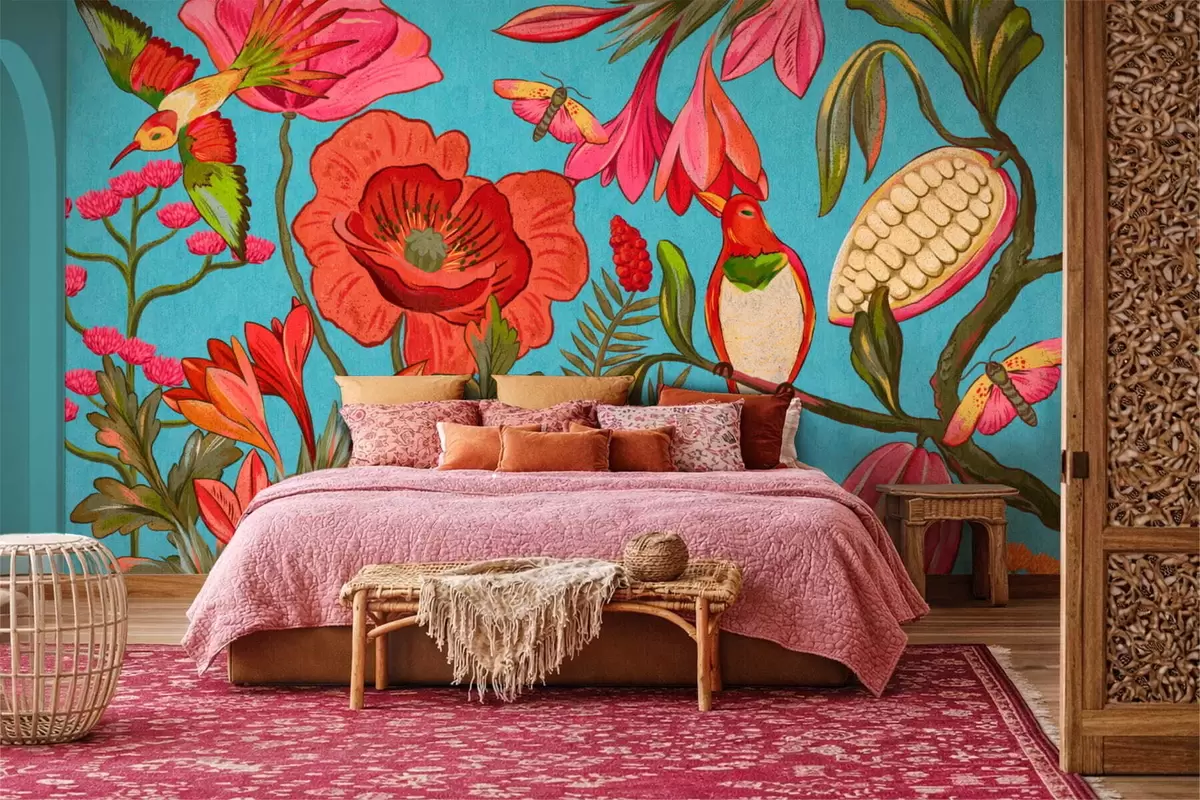 Fotomurales Flores y pájaros decorativos sobre fondo azul Nr. w05036v3
