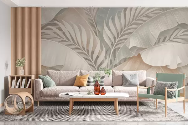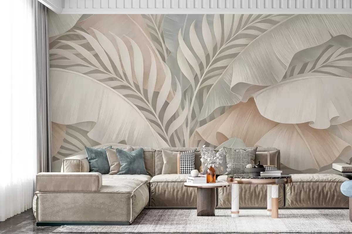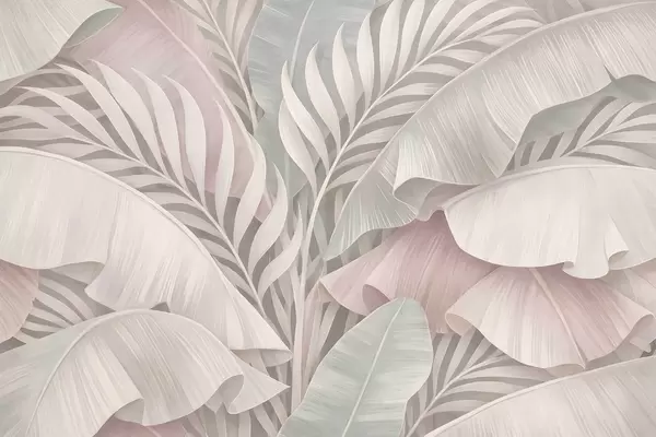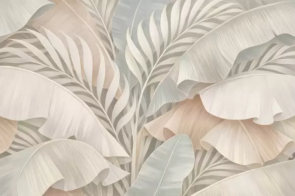 Fotomurales Grandes hojas tropicales en tonos melocotón y turquesa apagado. Nr. w05062