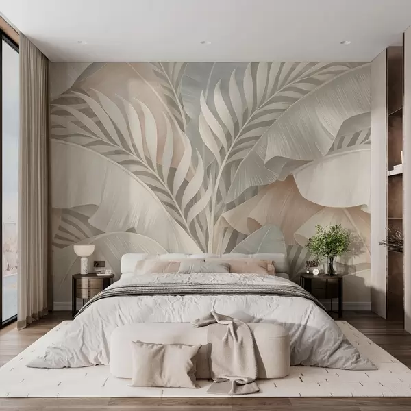 Fotomurales Grandes hojas tropicales en tonos melocotón y turquesa apagado. Nr. w05062