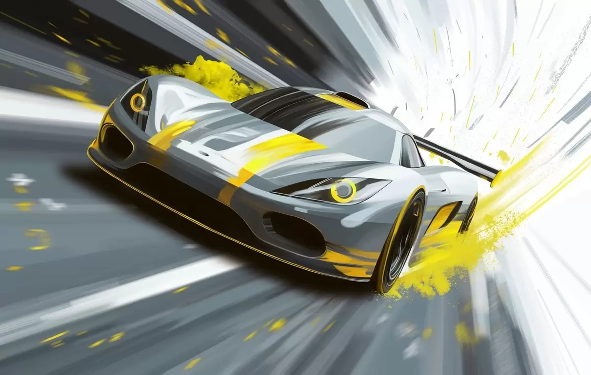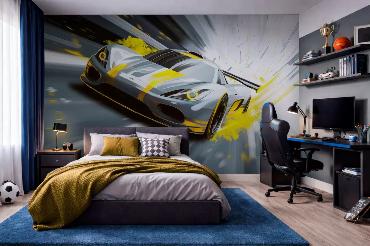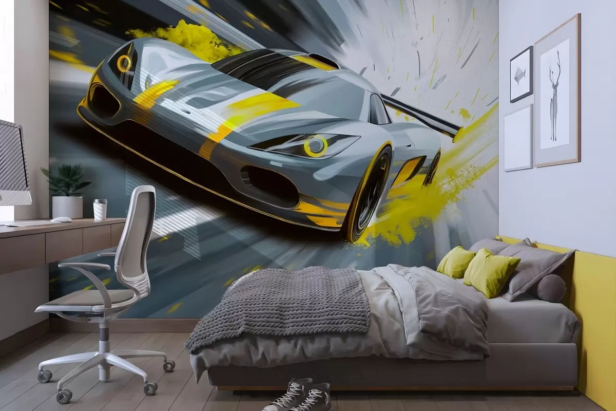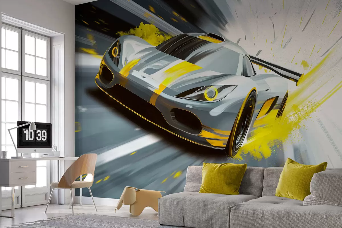 Fotomurales Coche deportivo dinámico con estilo de dibujo digital y detalles en amarillo. Nr. w05069v2