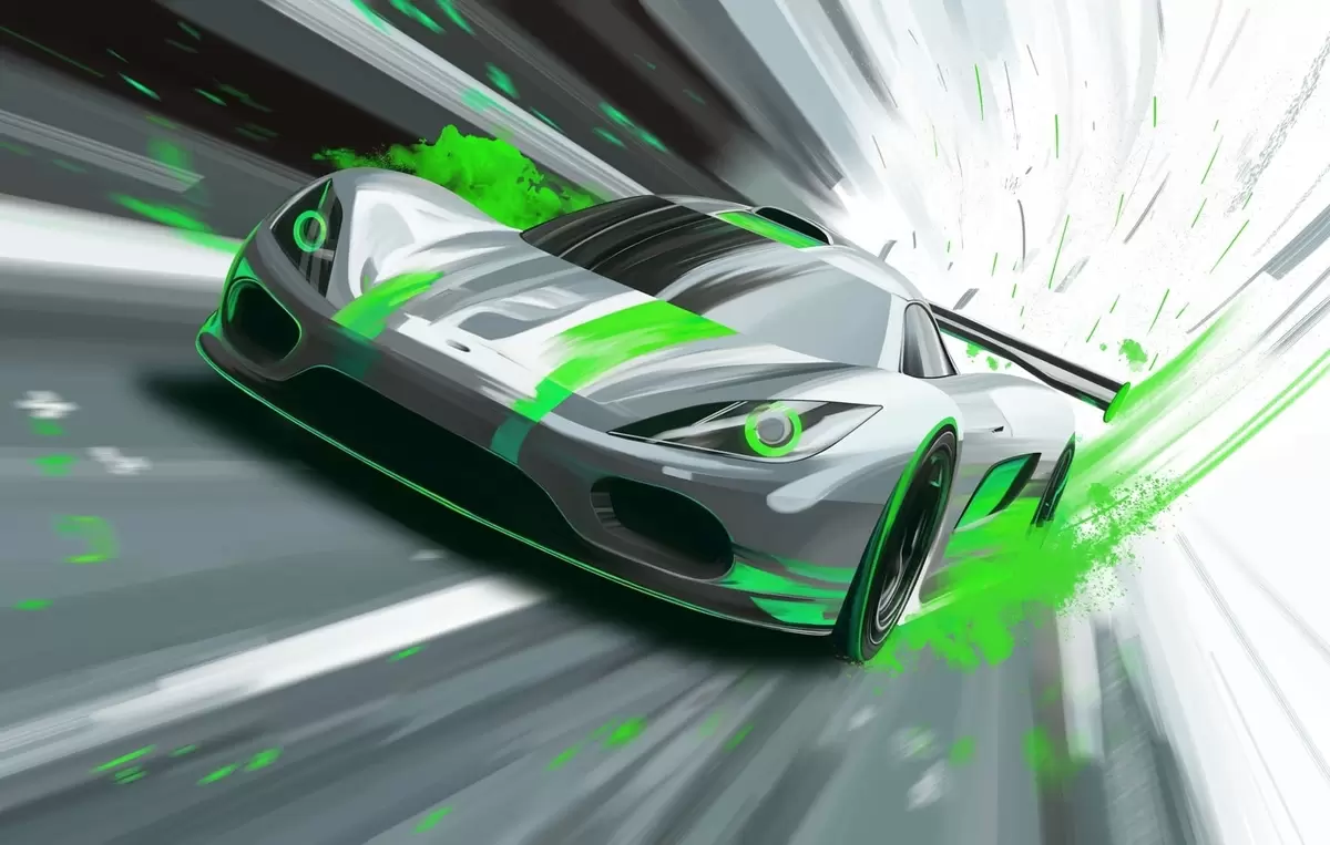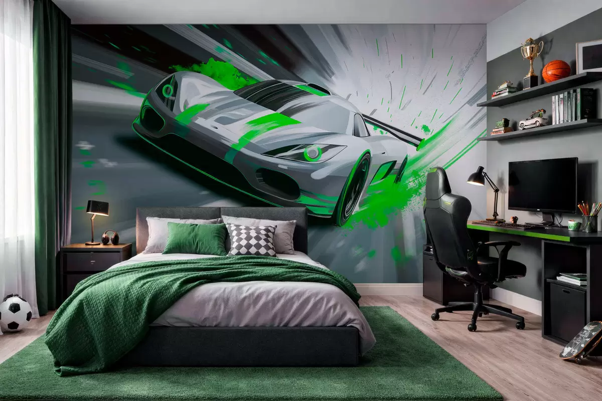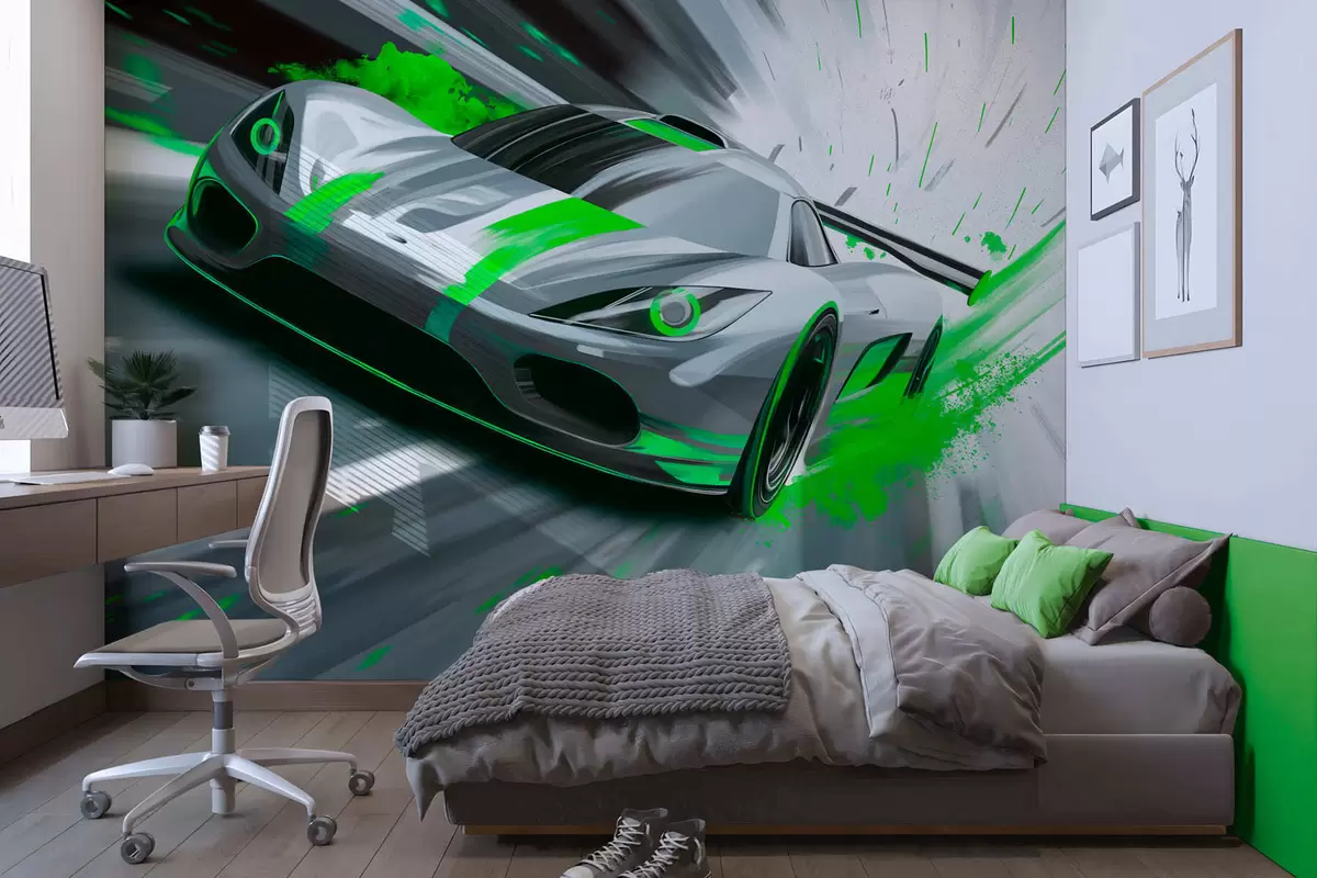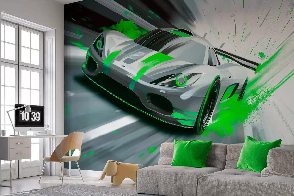 Fotomurales Coche deportivo dinámico con estilo de dibujo digital y detalles en verde. Nr. w05069v4
