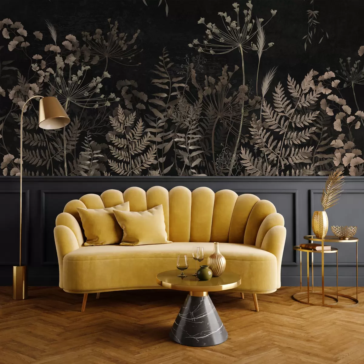 Fotomurales Diseño botánico oscuro con flores y hojas. Nr. w05092