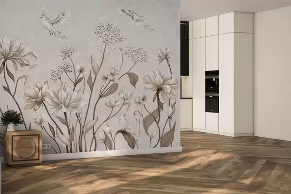 Fotomurales Flores claras y pájaros sobre un fondo suave Nr. w05118