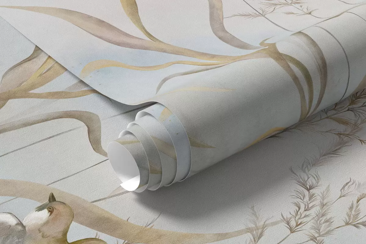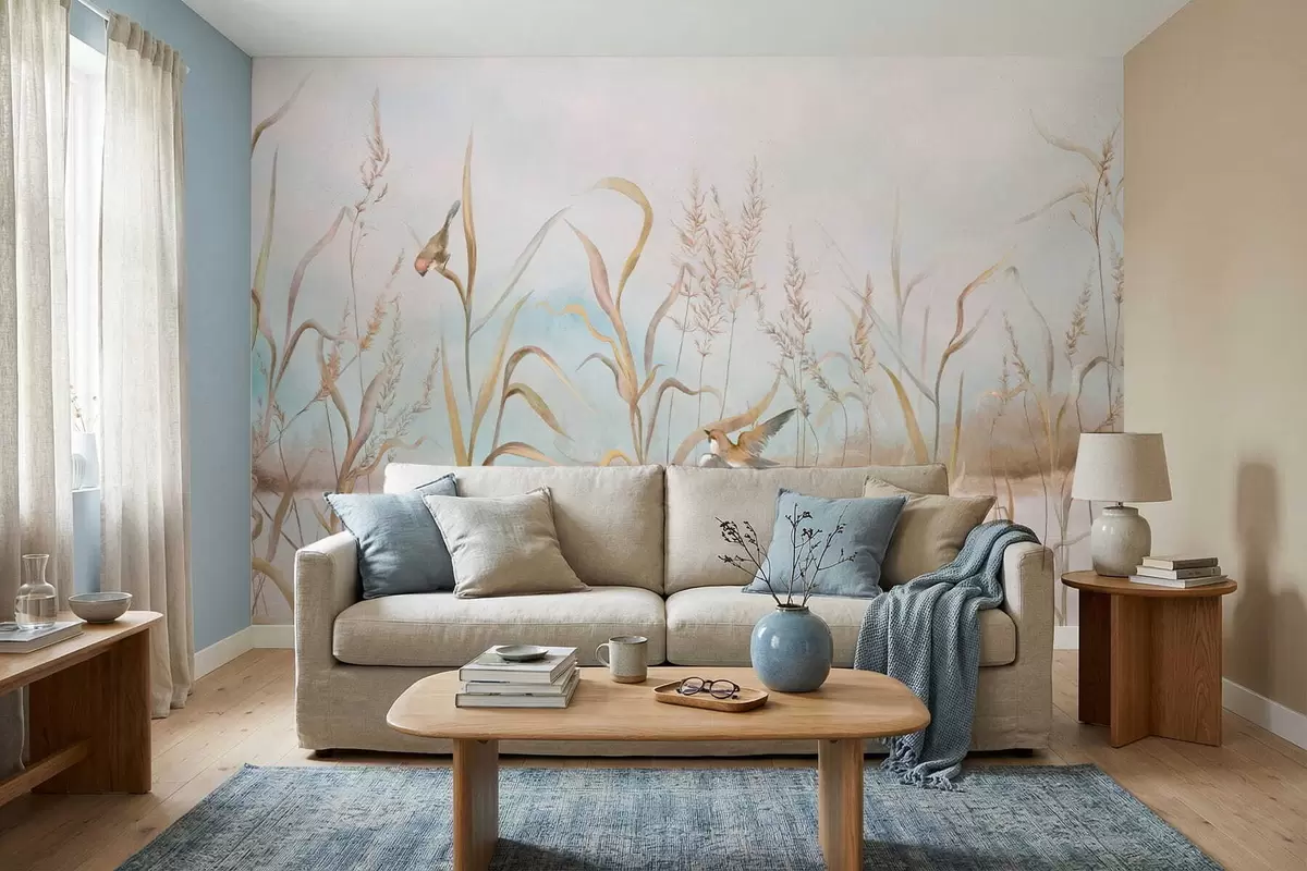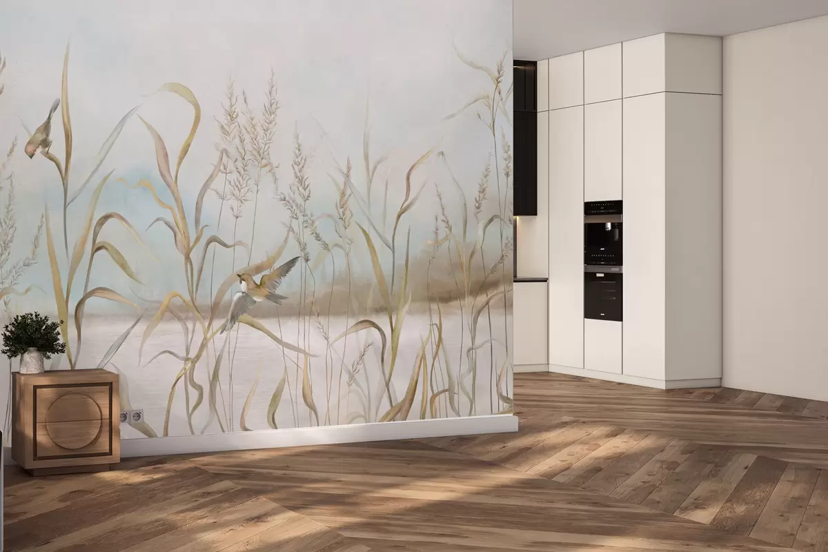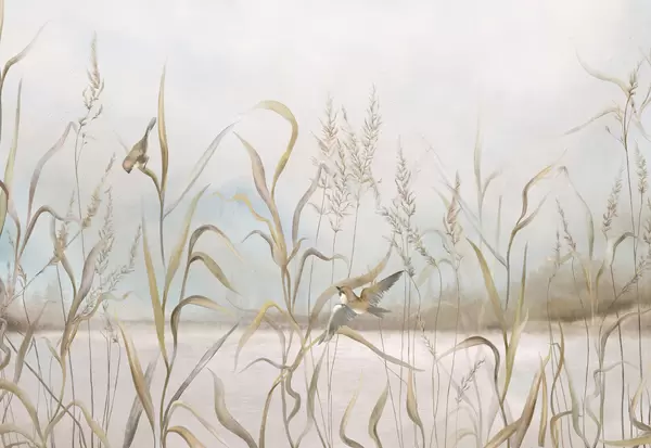 Fotomurales Ilustración de juncos y pájaros junto al agua en tonos suaves. Nr. w05125