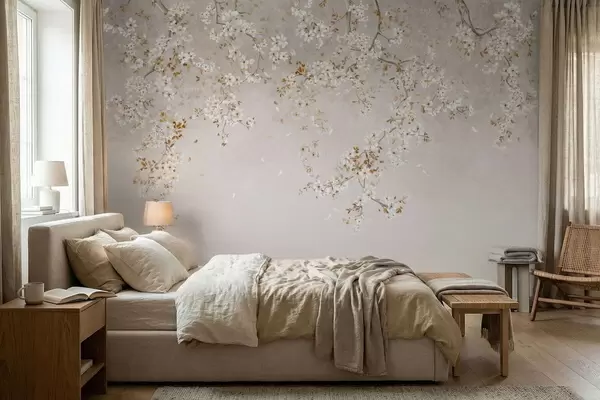 Fotomurales Ramas con flores blancas sobre un fondo beige suave. Nr. w05129