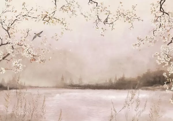 Fotomurales Delicadas ramas en flor junto al lago con pájaros en una ligera niebla. Nr. w05155