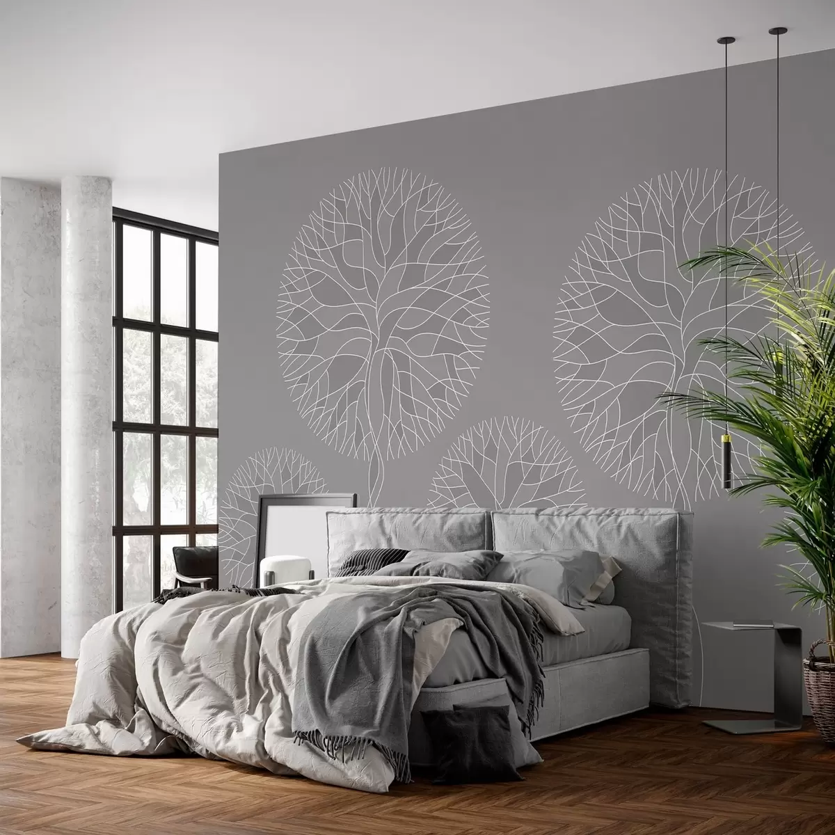 Fotomurales Árboles lineales fantásticos con copas frondosas en tonos grises medios. Nr. w05213v5