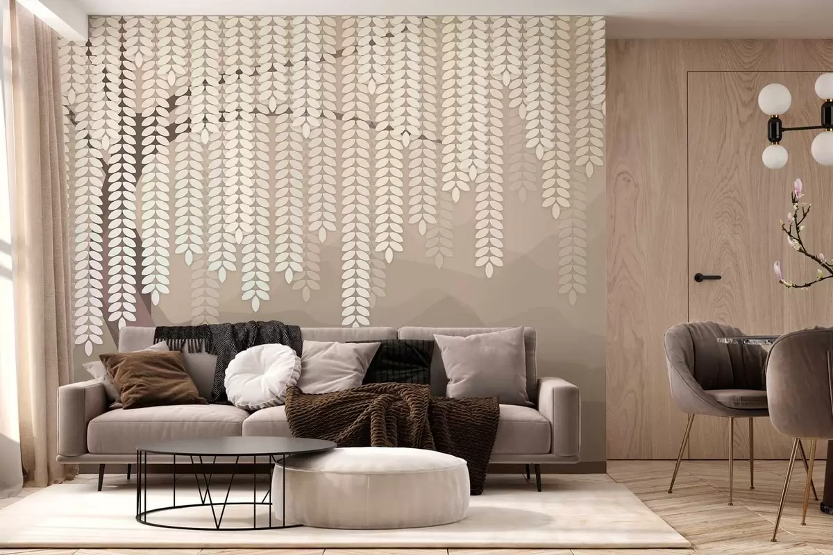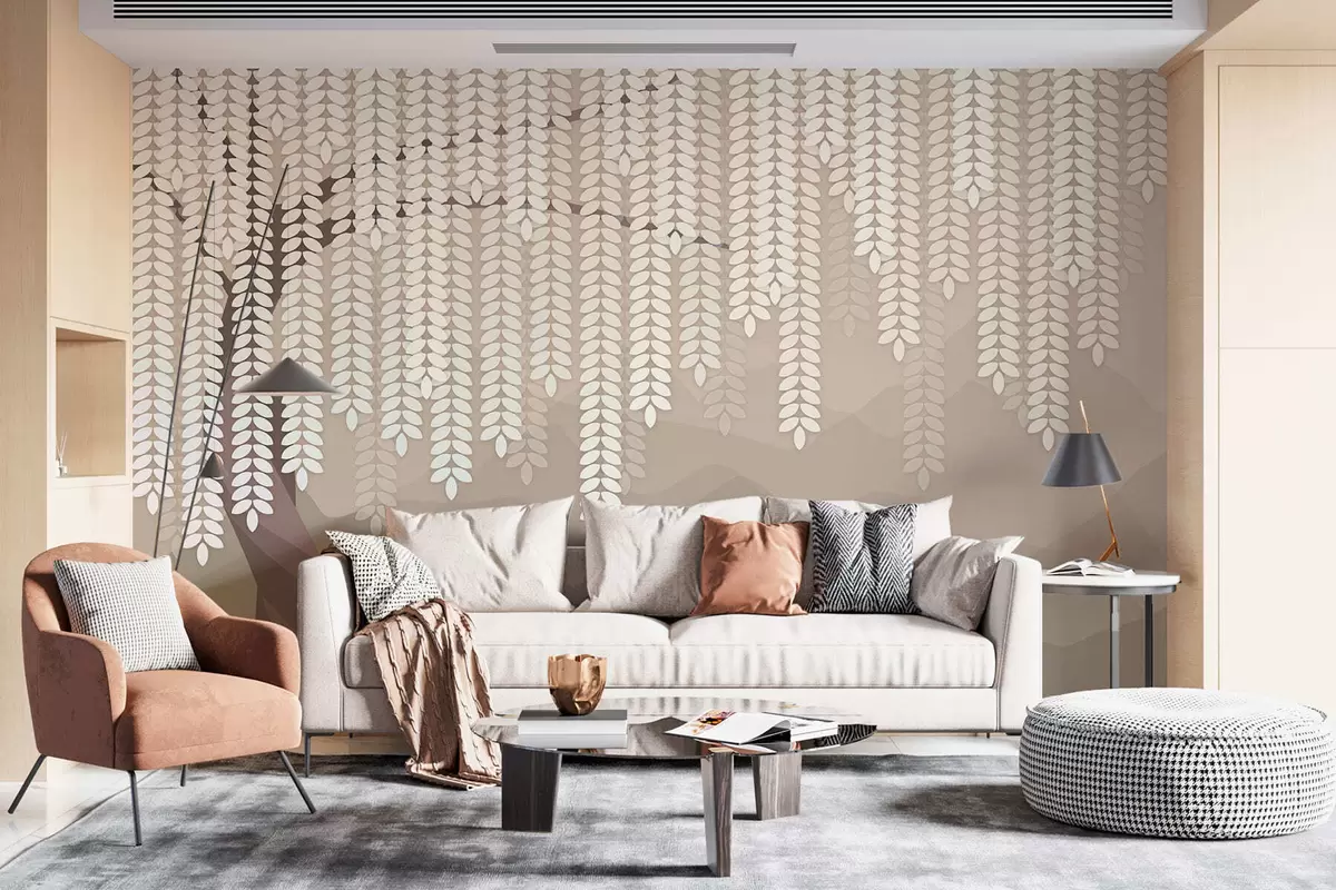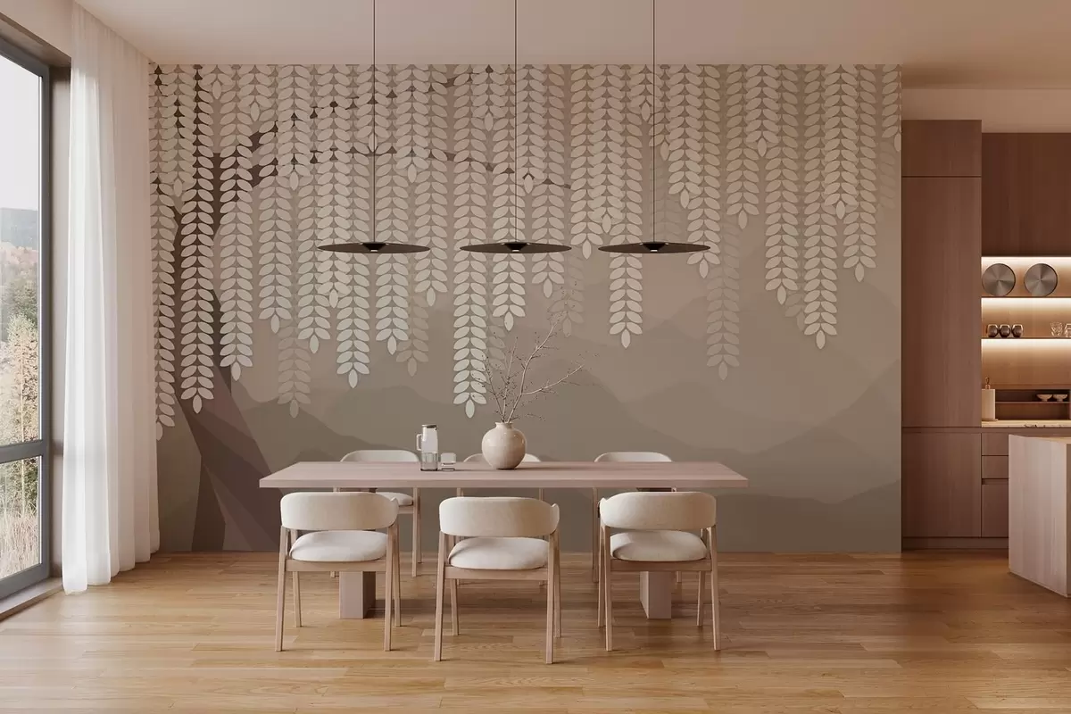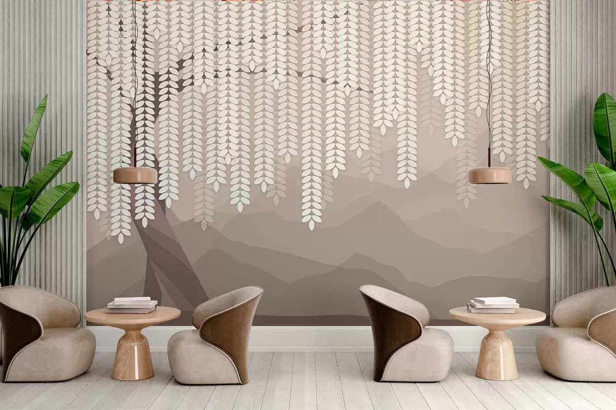 Fotomurales Sauce estilizado con hojas colgantes sobre un fondo de montañas minimalistas en tonos café. Nr. w05232v2