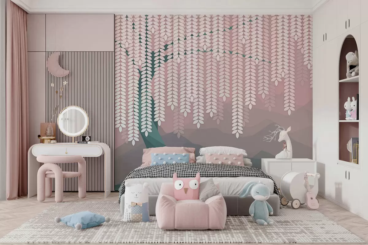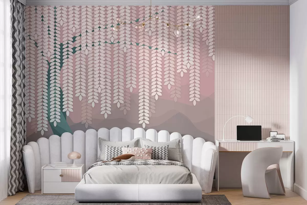 Fotomurales Árbol de sauce estilizado con hojas colgantes sobre un fondo de montañas minimalistas en tonos rosa y verde oscuro. Nr. w05232v4