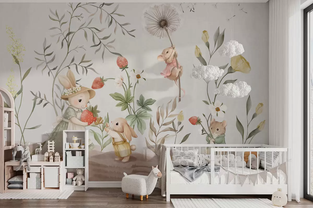 Fotomurales Ilustración infantil de un conejito y un ratoncito entre plantas y flores Nr. w05422