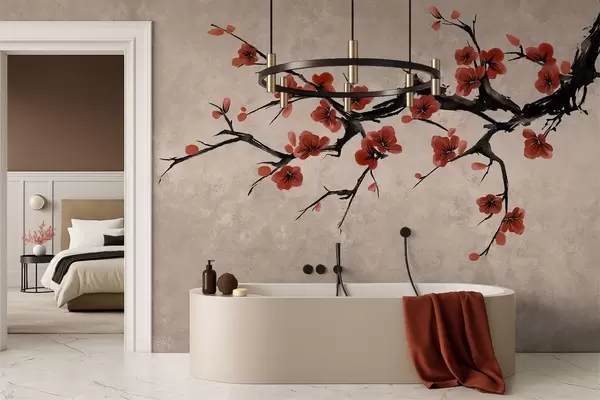 Fotomurales Rama con flores de estilo oriental sobre fondo beige Nr. w05425v4