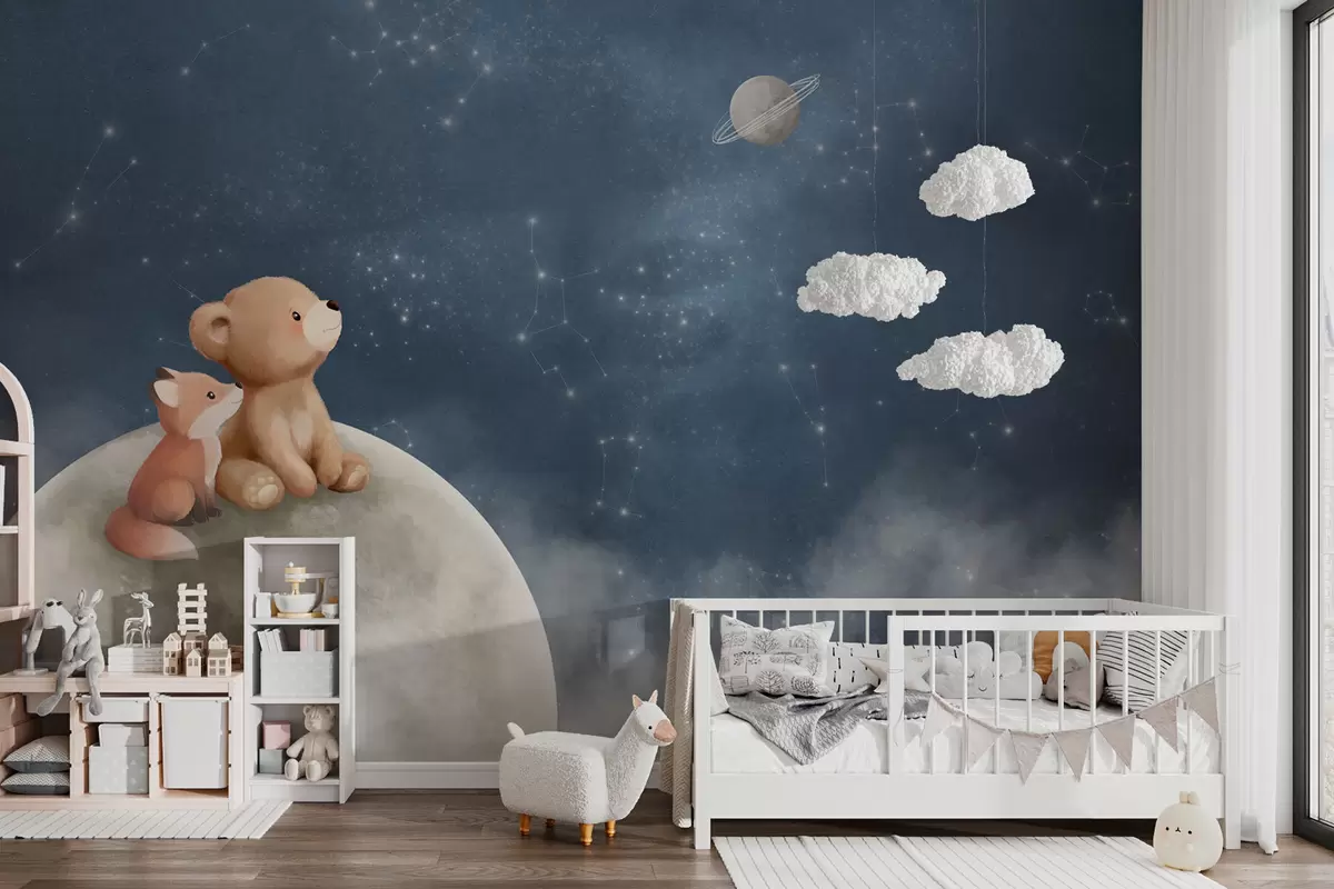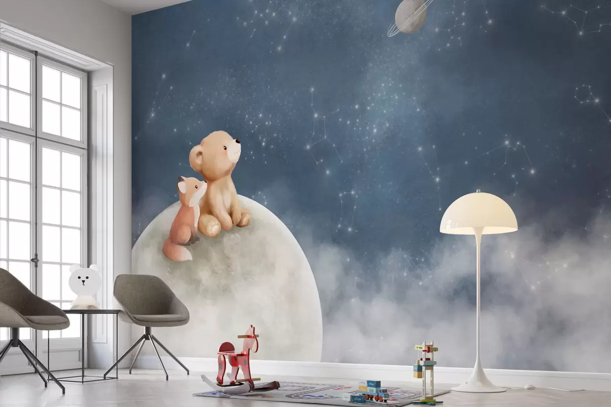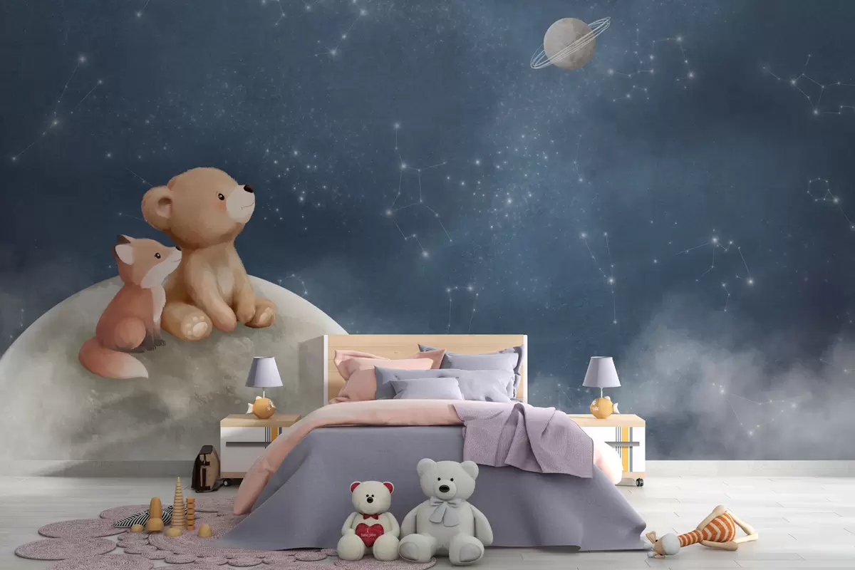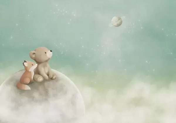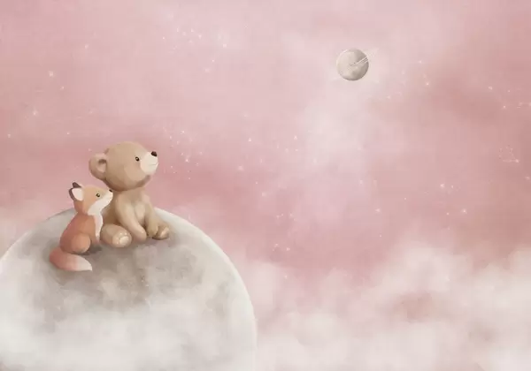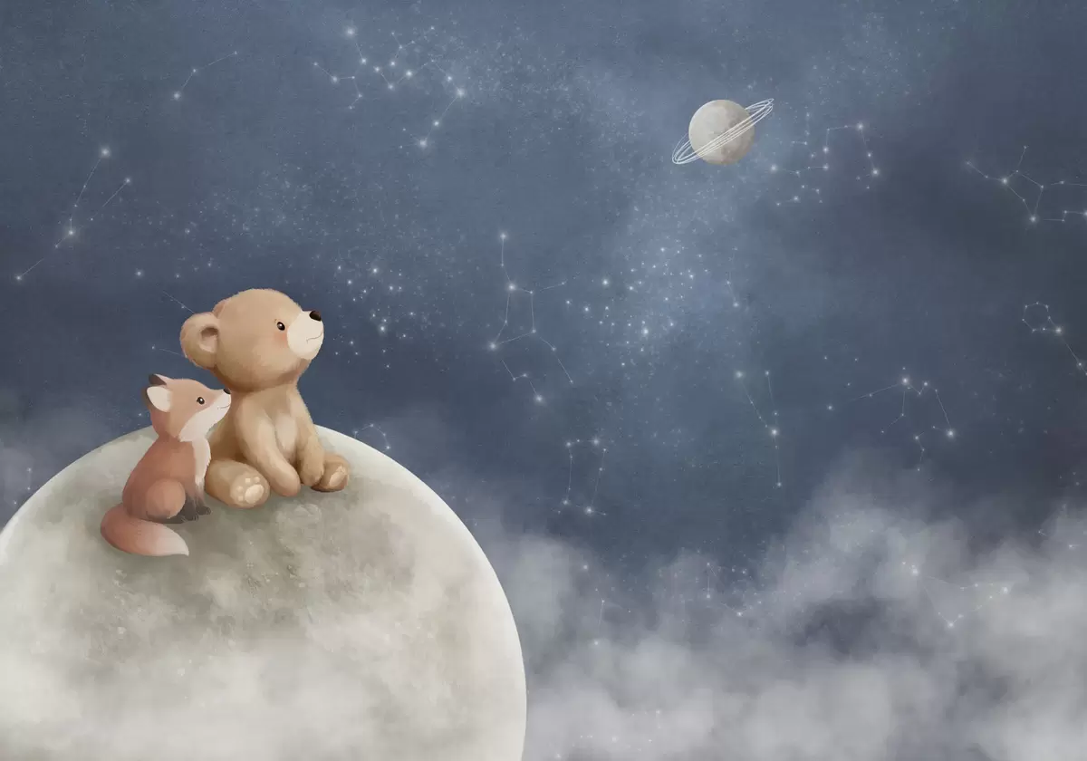 Fotomurales Ilustración en tonos pastel de un oso y un zorro bajo el cielo nocturno Nr. w05431