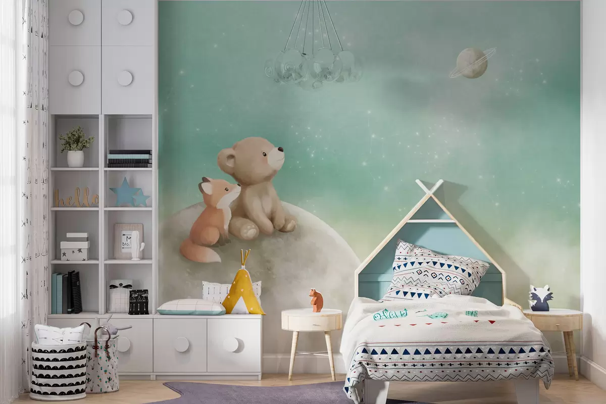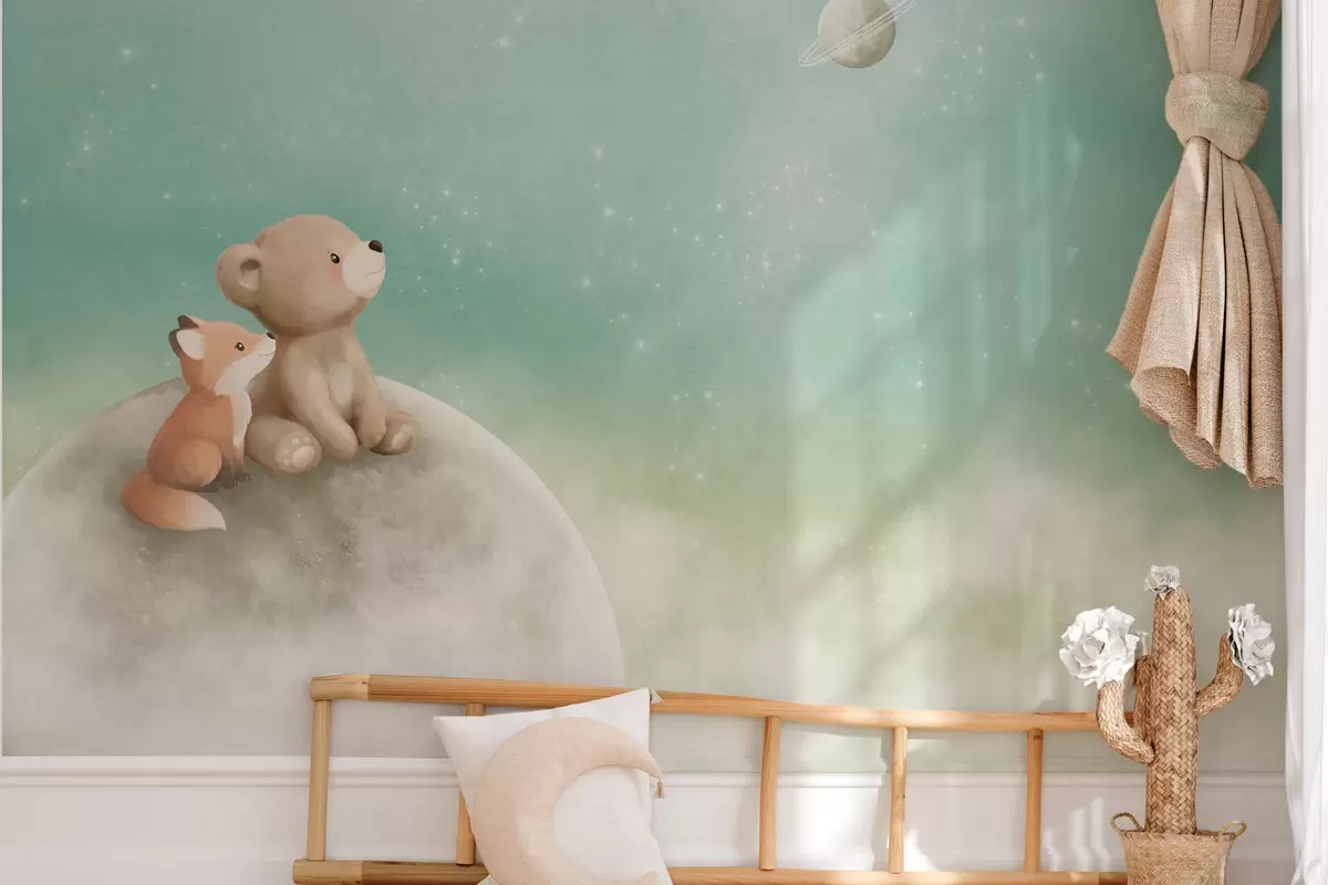 Fotomurales Ilustración al pastel de un oso y un zorro bajo un cielo verde Nr. w05431v1