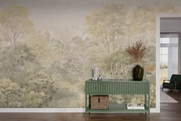 Fotomurales Paisaje forestal de estilo vintage en tonos verdes apagados Nr. w05433