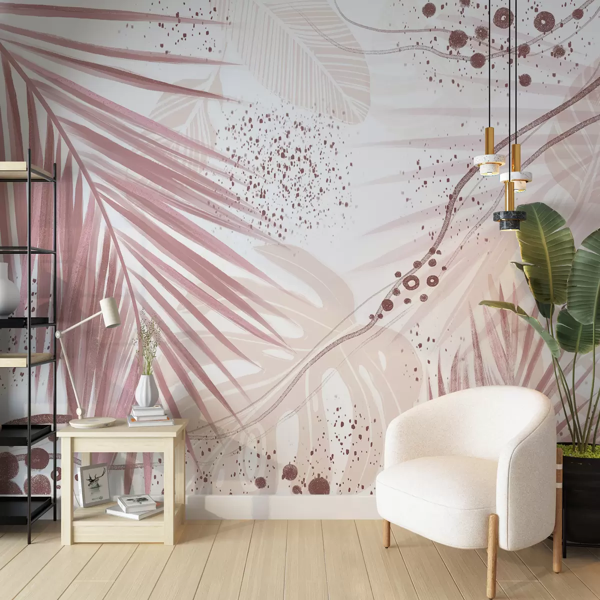 Fotomurales Hojas y frondas de palmeras de color rosa tropical, con formas abstractas y salpicaduras en tonos de rosa y blanco. Nr. w07918v1