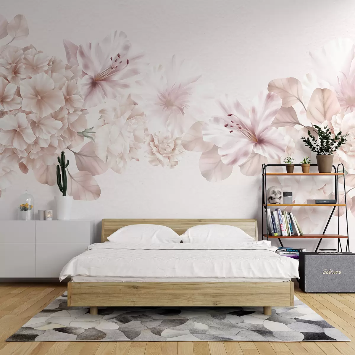 murales de pared Arreglo floral rosa suave y blanco, con delicados pétalos y flores sobre un fondo claro w07923
