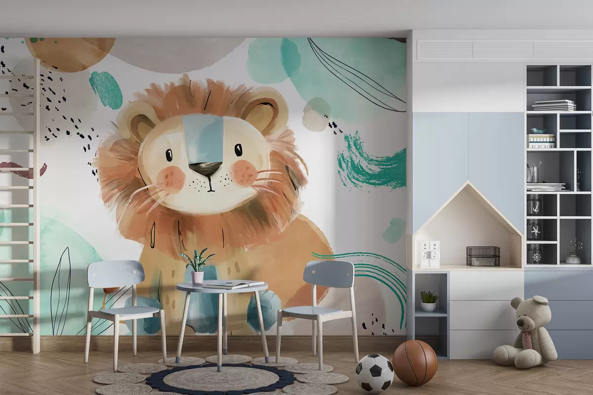 Fotomurales Un lindo león de dibujos animados en un fondo colorido y abstracto con pinceladas y salpicaduras de colores pastel Nr. w07924